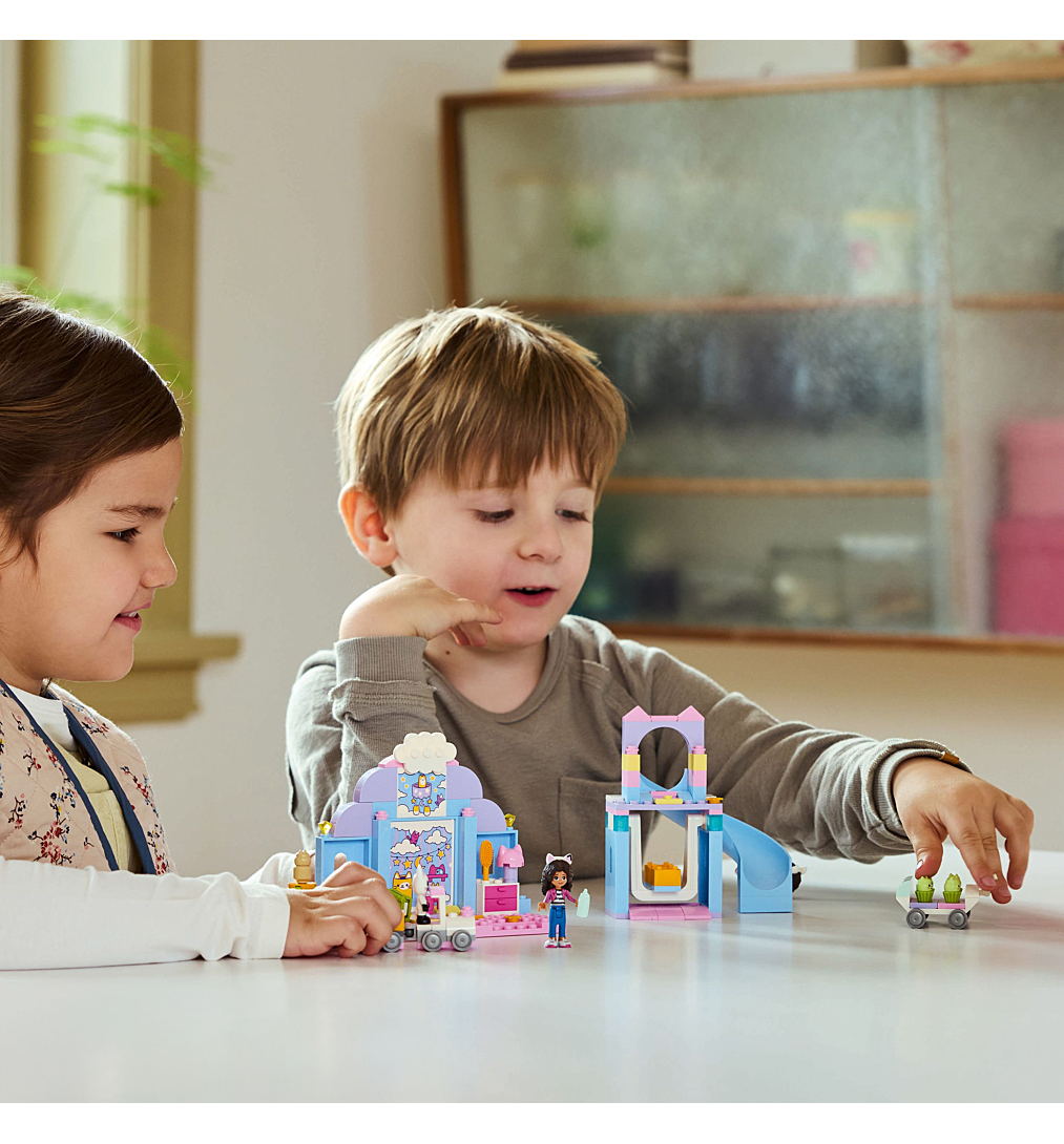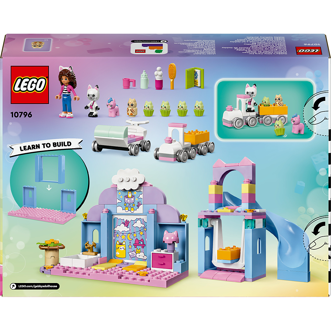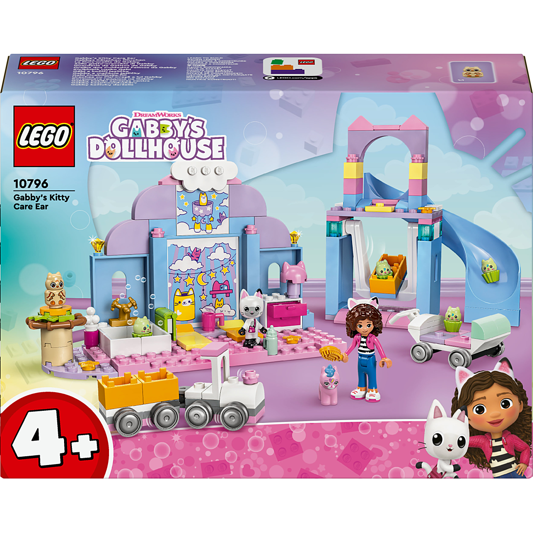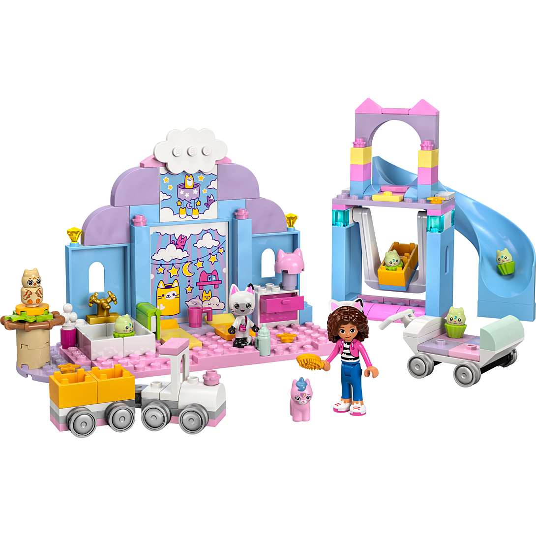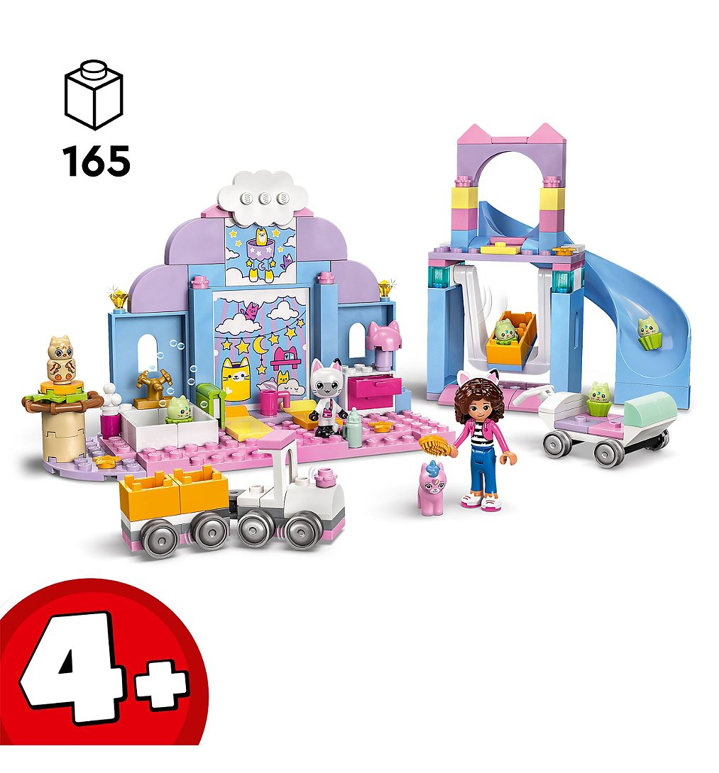 La Nurs’oreille de Gabby (10796) est un jouet éducatif d’imitation pour les fans de la série TV Gabby et la maison magique de DreamWorks Animation à partir de 4 ans. Ce jouet convient autant pour les filles et les garçons d’âge préscolaire, et participe à améliorer la confiance, la concentration et les capacités de résolution de problèmes des enfants. Avec ce set LEGO Gabby et la maison magique, les enfants peuvent également développer la narration et le jeu de rôle, au fur et à mesure qu'ils jouent seul, entre amis, ou en famille. Vous cherchez un cadeau d'anniversaire pour les jeunes enfants qui aiment prendre soin des animaux ? Ce jouet est parfait. Il inclut une mini-poupée de Gabby et les figurines de Pandy Pattes, Bébé Chalicorne, Bébé Mibou et 4 Bébé Cupcakes. Le set contient une balançoire, un toboggan, un train et une poussette en forme de moule à 4 cupcakes. Il y a une baignoire avec des accessoires, dont un shampoing et une brosse. Le biberon, la tasse, le livre et les lits confortables assurent une sieste agréable aux bébés. Le set inclut une brique de démarrage qui facilite la construction. Les instructions illustrées et colorées sont fournies sous forme d’histoire, pour permettre aux plus jeunes de comprendre sans devoir lire.