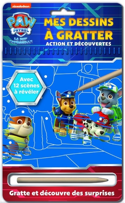 Paw Patrol La Pat' Patrouille Mes dessins à gratter En route pour une nouvelle aventure et des surprises avec toute la Pat' Patrouille ! Détache ton crayon en bois et découvre de jolis dessins en grattant sur les parties avec des points. Tu y découvriras tes héros préférés. En face des dessins à gratter, tu trouveras un jeu de recherche de détails ou des questions pour t'amuser. 24 pages de découvertes avec la Pat' Patrouille ! Amuse-toi bien ! Avec 12 scènes à révéler