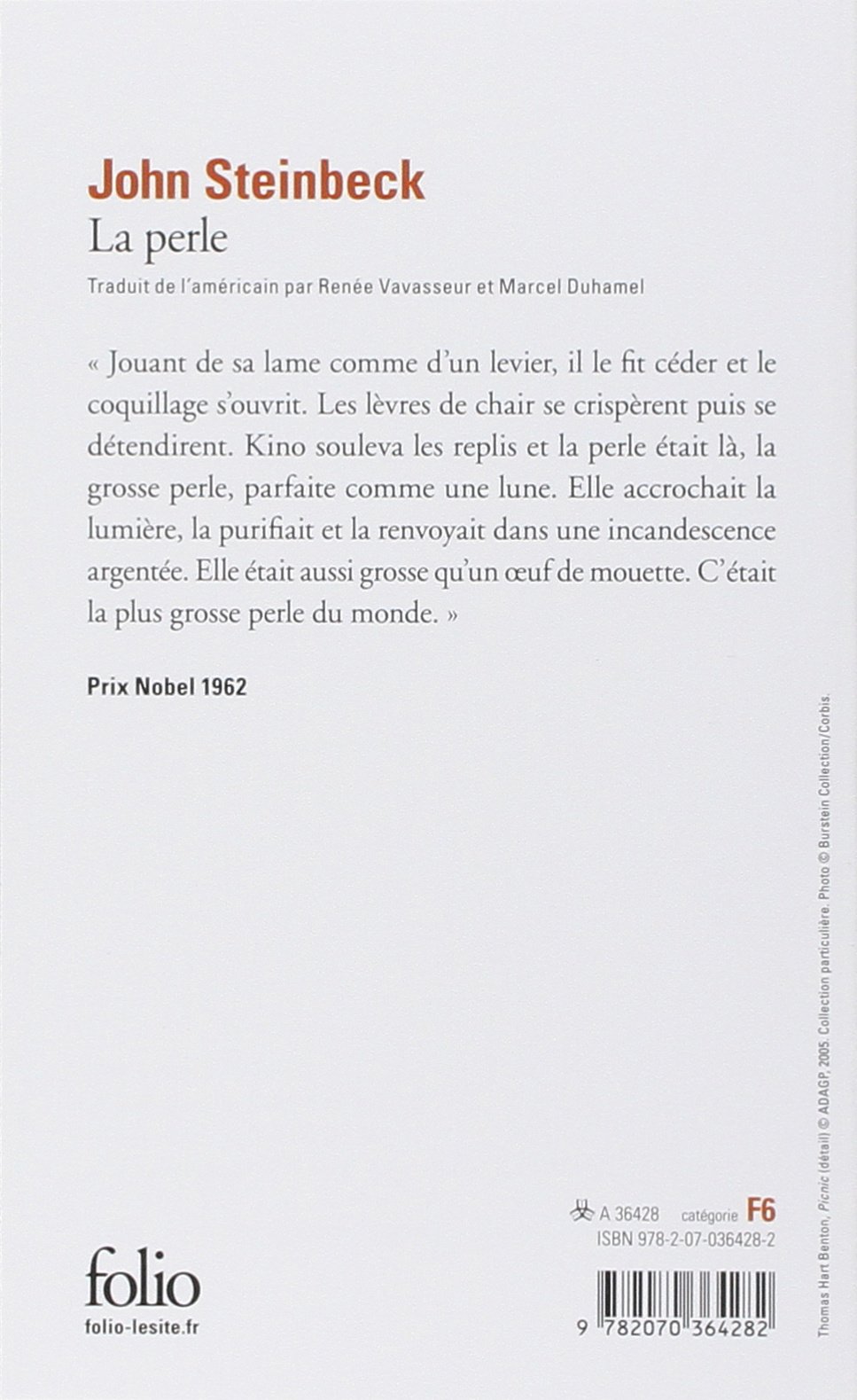"Jouant de sa lame comme d'un levier, il le fi t céder et le coquillage s'ouvrit. Les lèvres de chair se crispèrent puis se détendirent. Kino souleva les replis et la perle était là, la grosse perle, parfaite comme une lune. Elle accrochait la lumière, la purifi ait et la renvoyait dans une incandescence argentée. Elle était aussi grosse qu'un oeuf de mouette. C'était la plus grosse perle du monde."