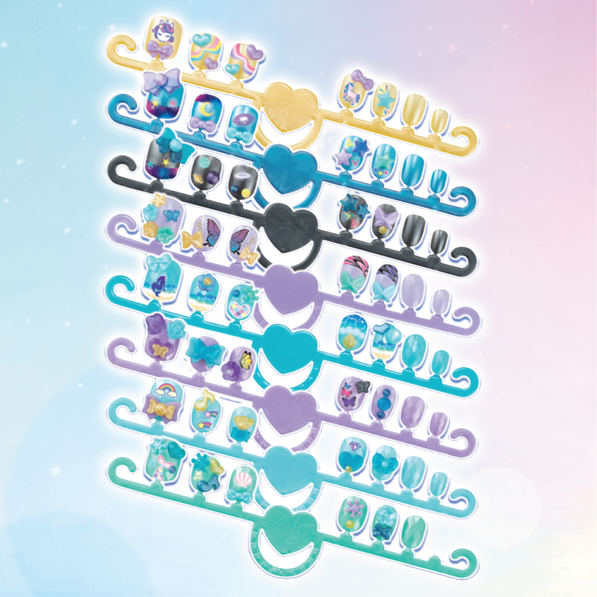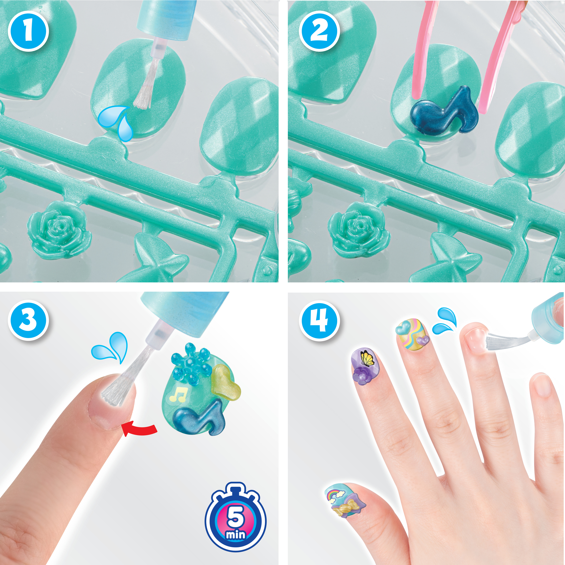 Cette recharge contient des ongles et décorations supplémentaires à utiliser en complément des coffrets pour prolonger l’activité créative. Choisis les ongles adaptés à ta taille. Décore les avec des autocollants. Puis, pose dessus des petits accessoires selon ton envie en les faisant adhérer avec de l’eau : ils colleront comme par magie ! Ensuite, pose un petit peu d’eau sur ton ongle, place l’ongle Aquabeads que tu as préparé, fais sécher 3 minutes : la magie opère de nouveau ! Change ta manucure à l’infini, selon tes envies, et en toute sécurité !
