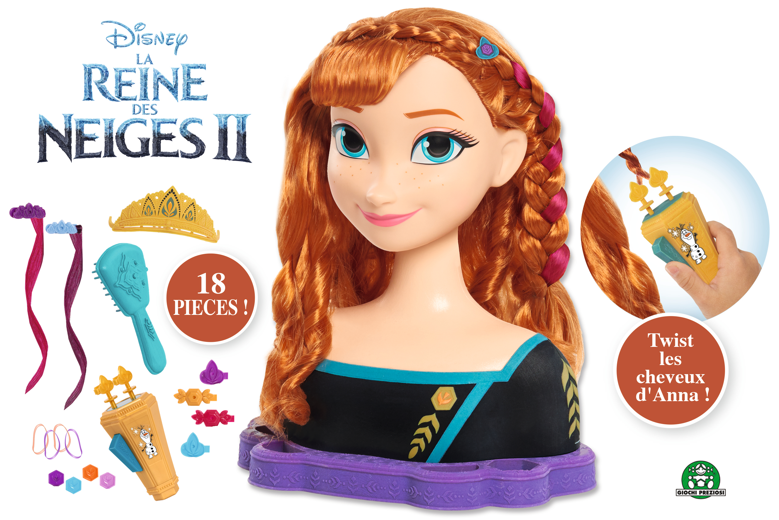 | Plus produit | TÊTE À COIFFER : Avec la tête à coiffer Deluxe Anna, fais plein de coiffures fantastiques à Anna ! TWISTER : Grâce au twister aux couleurs d\'Olaf, tu peux lui twister les cheveux à l\'infini ! Trop joli ! 18 ACCESSOIRES : Ce coffret contient 1 tête à coiffer Anna et 17 accessoires.\n AGE : à partir de 3 ans. |