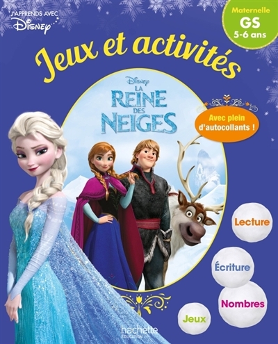 La Reine des Neiges Jeux et activités Maternelle Un cahier d 'activités pour apprendre en s'amusant ! . Des activités simples et ludiques, adaptées aux enfants de 5 à 6 ans . Des activités pour consolider les apprentissages de préparation à la lecture, à l'écriture et aux mathématiques . Des jeux pour développer le sens de l'observation, de l'orientation... Lecture . Reconnaître différentes écritures . Reconnaître des lettres . Reconnaître un mot Écriture . Développer son habileté manuelle . Reproduire un motif graphique . Écrire des lettres majuscules . Écrire des lettres cursives Nombres - Logique . Compter jusqu'à 10 . Suivre un chemin . Se repérer dans l'espace . Compléter un tableau Jeux . Se repérer dans l'espace . Trouver des différences . Compléter un puzzle... Avec plein autocollants !