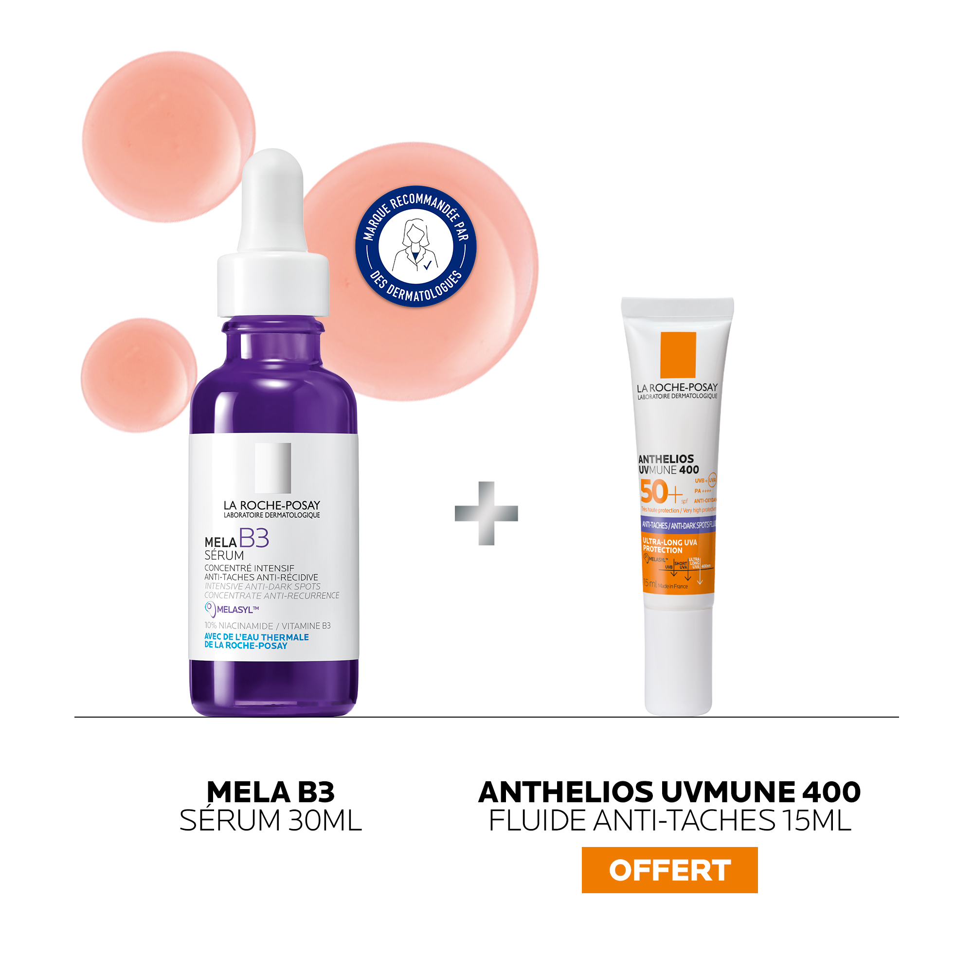 Coffret anti-taches anti-récidive enrichi en Melasyl™ : le sérum visage Mela B3 40ml avec une protection solaire anti-taches SPF50+ Anthelios 15ml OFFERTE. Hyperpigmentation. Taches brunes persistantes. Marques d'acné. MELA B3 SERUM Résultats visibles dès 1 semaines* 4 femmes sur 5 ont des taches persistantes corrigées?** 98% des femmes voient le nombre de taches diminuer après une semaine?*** 98% des femmes voient la couleur des taches s'éclaircir après une semaine*** 96% des femmes voient la taille des taches diminuer après une semaine3*** *Auto-évaluations, 70 et 53 sujets?**Étude clinique réalisée sur 41 sujets présentant une tache persistante, diminution du contraste et/ou de la taille de la tache, application du sérum Mela B3 pendant 8 semaines ***Test consommateur, 50 femmes ANTHELIOS UVMUNE 400 FLUIDE ANTI-TACHES SPF 50+ : L’efficacité de cette protection solaire a été cliniquement prouvée* : 78% des utilisatrices constatent une réduction du nombre de taches. 81% des utilisatr
