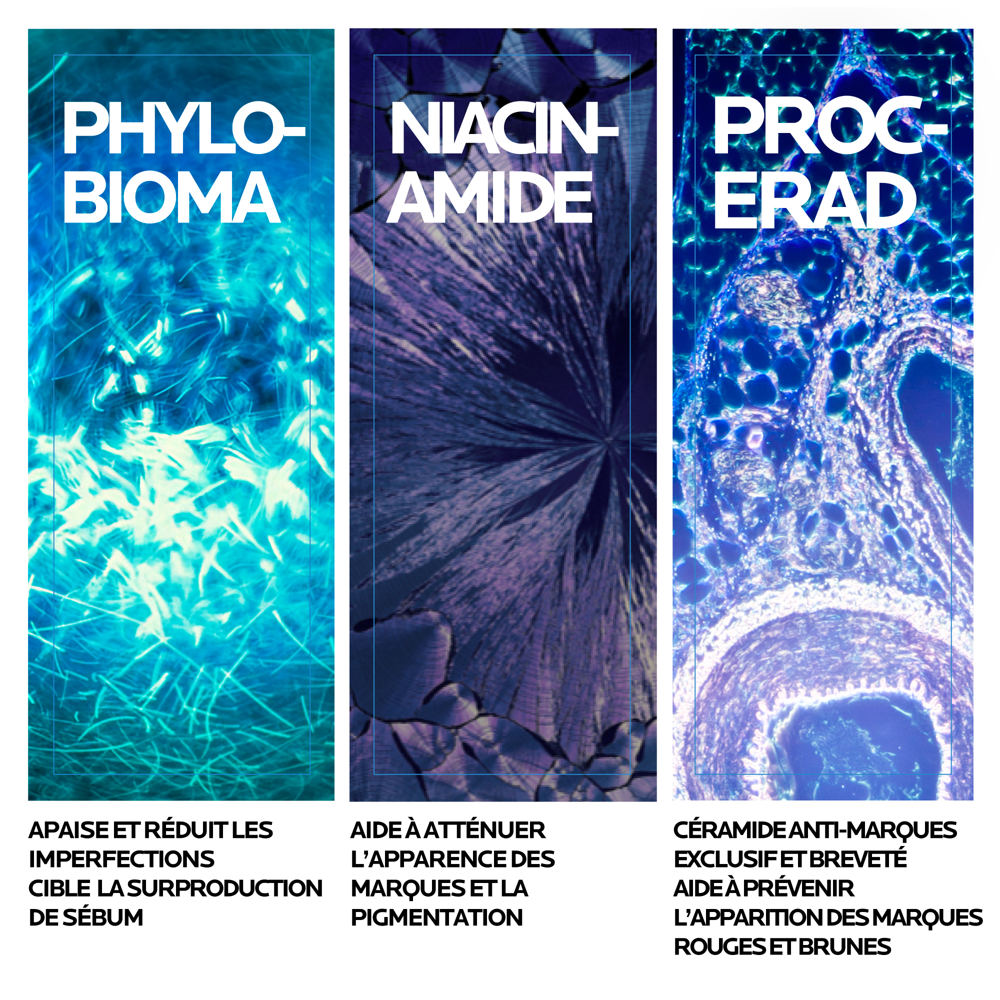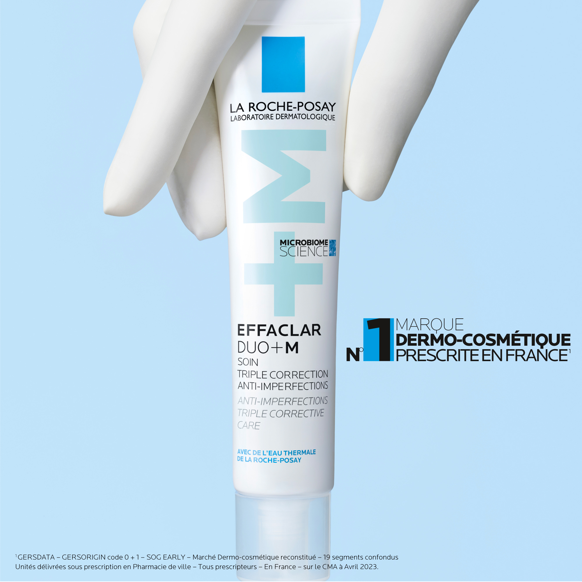 INNOVATION Effaclar Duo+M, soin triple correction anti-imperfections pour les peaux grasses à tendance acnéique, désormais enrichi par la science du microbiome. Corrige les boutons, les points noirs et les marques post-acné. Désormais efficacité visible dès 8H*. Anti-rechute**. Testé sur tous les phototypes de peau. Convient dès 10 ans. *Test consommateur, 54 sujets, après 1 application. **Étude clinique, 100 sujets, 3 mois d'entretien après l'arrêt d'un traitement topique contre l'acné (Peroxyde de benzoyle) Efficacité visible dès 8H* Anti-imperfections : boutons et points noirs. Le nouvel actif Phylobioma cible le phylotype IA1 pour réduire significativement les imperfections, même sévères, sur tous les phototypes de peau. -44% Boutons** -66% Points noirs** Anti-marques : rouges et brunes. Atténue les marques tenaces et donne un teint uniforme à la peau. -45% marques*** Anti-rechute : 3 mois**** Maintien des bénéfices du traitement anti-acné, même 3 mois après l'arrêt. Hydratation :
