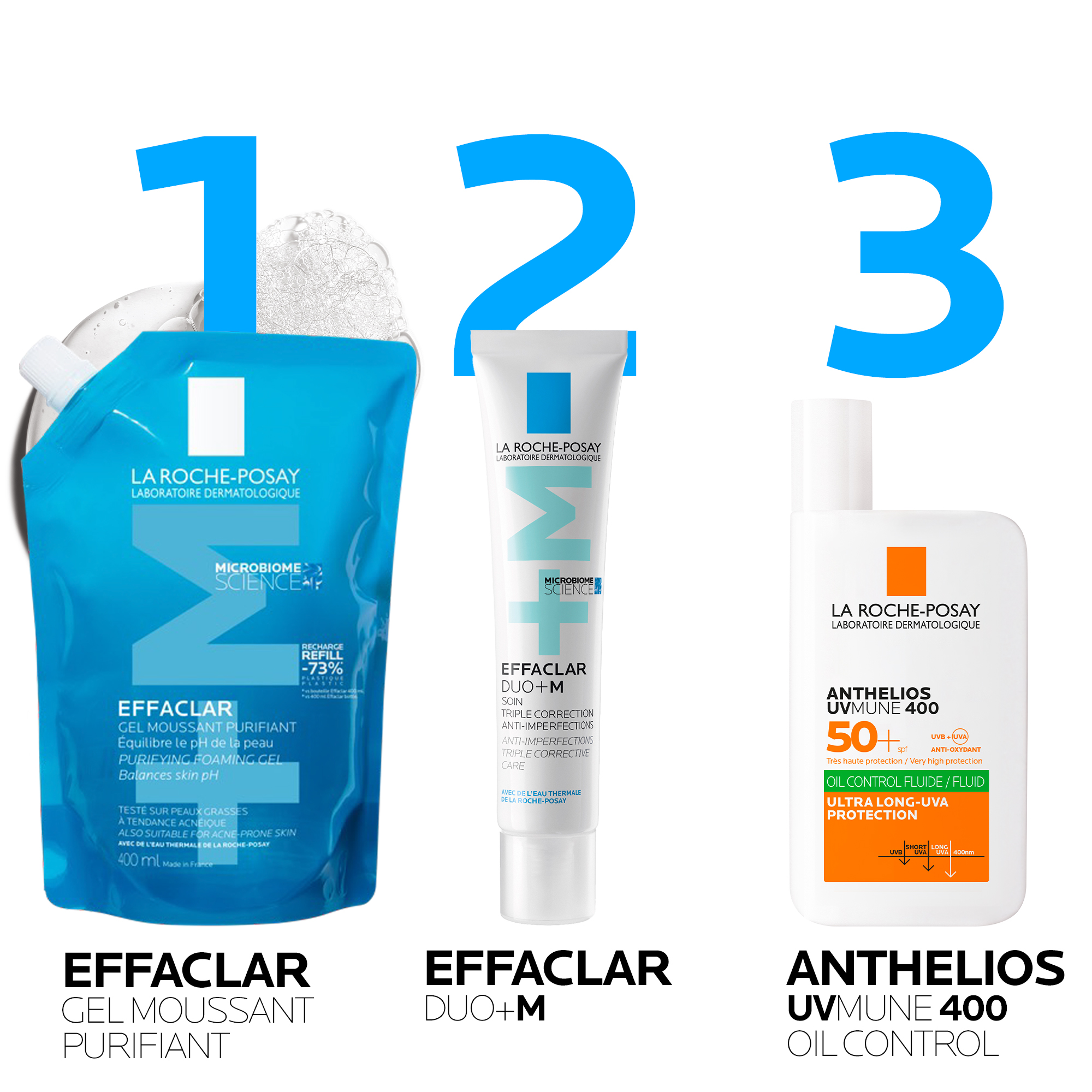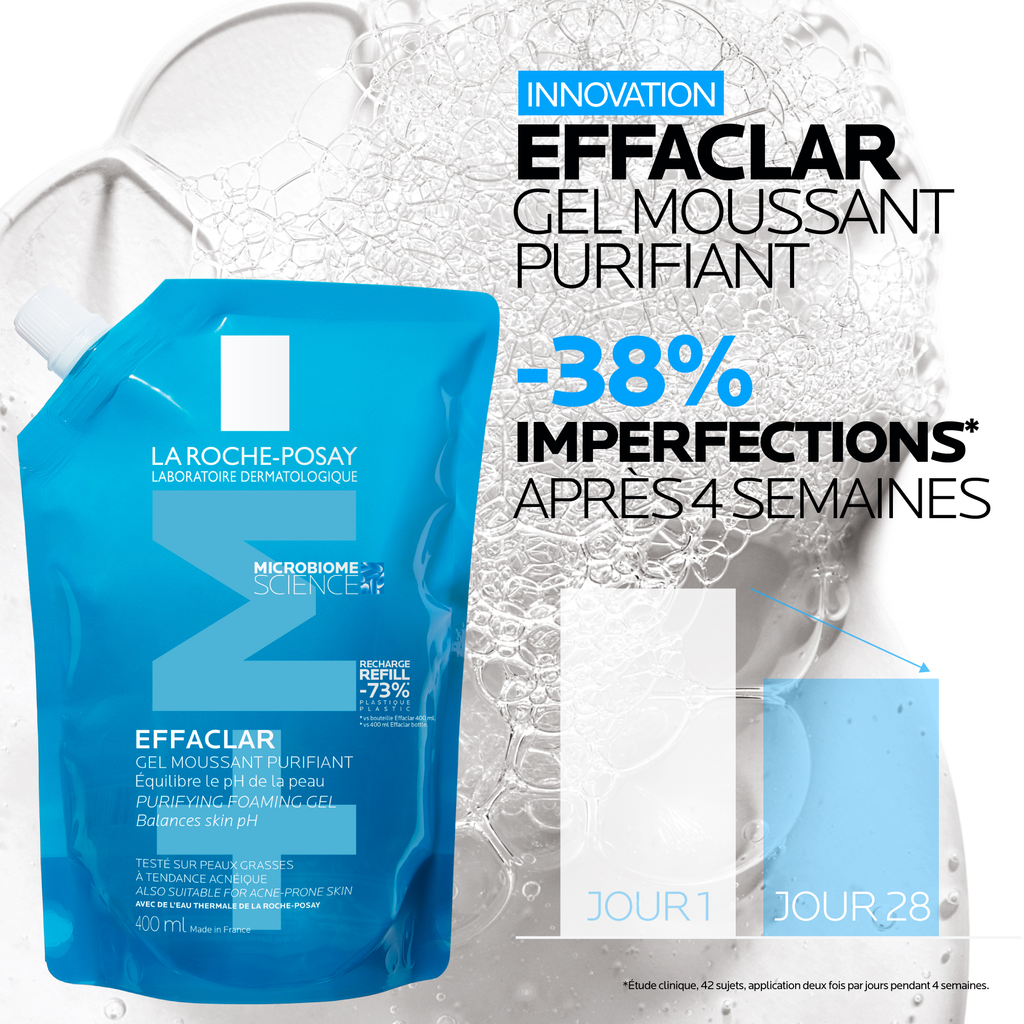INNOVATION. Les peaux acnéiques peuvent avoir un pH plus élevé que les peaux normales. Notre formule, inspirée par la science du microbiome, associe une technologie d'optimisation du pH avec le nouvel actif Phylobioma, contribuant à cibler une souche de la bactérie responsable des imperfections pour les réduire visiblement. Nettoie et purifie en douceur. Réduit les imperfections et la surproduction de sébum à la source. Laisse la peau nette et fraiche. Convient aux peaux grasses et sensibles à tendance acnéique. Sa formule est associée à l'Eau Thermale de La Roche-Posay, reconnue pour ses vertus apaisantes afin de limiter les risques d'irritations. APRÈS 4 SEMAINES : -38% imperfections* -44% points noirs* 98% peau purifiée en douceur** 100% peau nettoyée en douceur** *Étude clinique, 42 sujets, Effaclar Gel Moussant Purifiant, 2 fois par jour pendant 1 mois. **Auto-évaluation, 63 sujets après 1 mois.