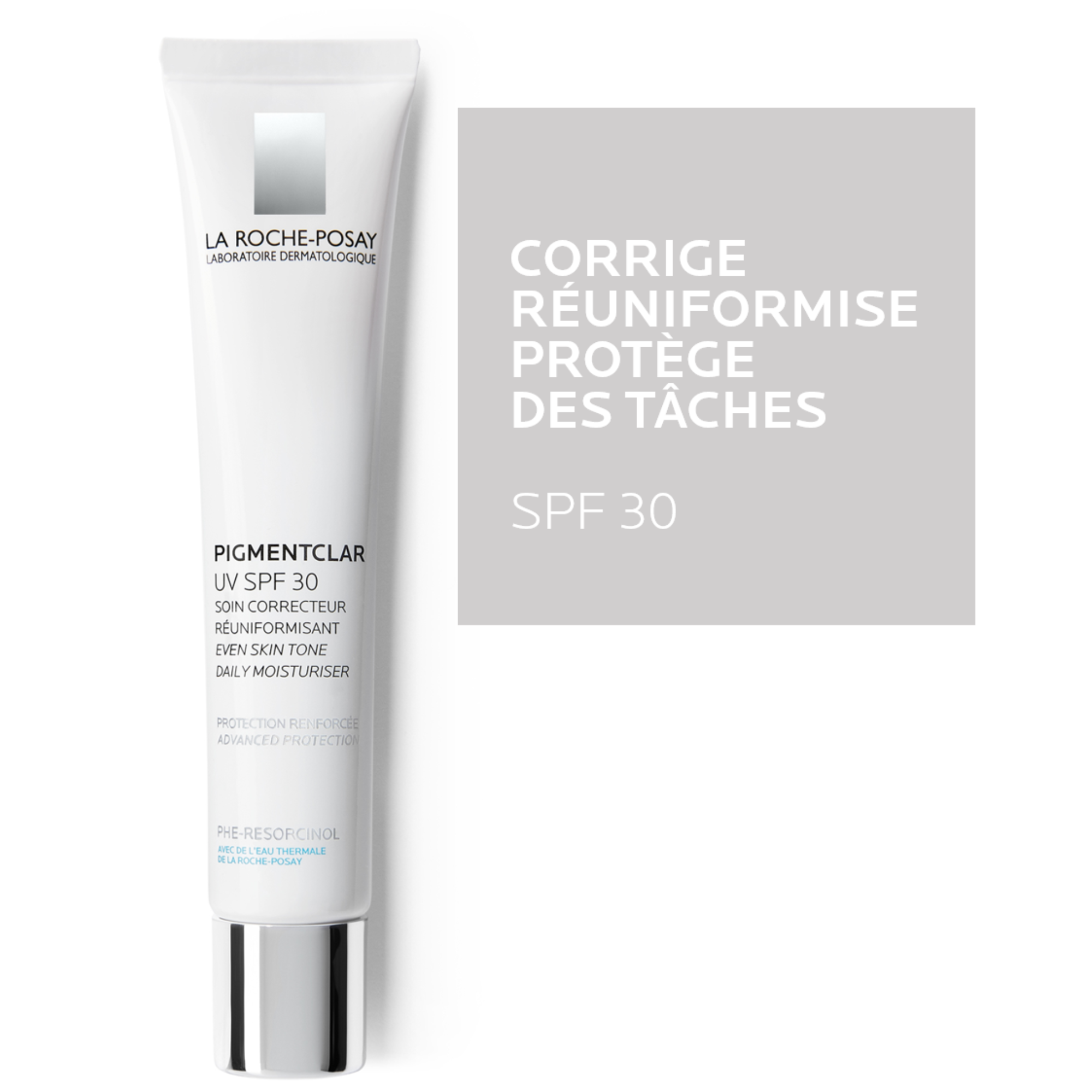 LA ROCHE-POSAY Pigmentclar Soin SPF30 Soin UV anti-tâches réuniformisant Protège la peau du teint terne et gris dus au stress oxydant, lui-même déclenché par la pollution et les UVA. Tous types de peaux dont peaux sensibles Immédiatement le teint est plus lumineux. Dès 4 semaines, les taches sont significativement diminuées pour un teint durablement plus uniforme. Les taches brunes sont réduites de 26,2% * *Test instrumental sur 40 femmes, après 4 semaines d’utilisation