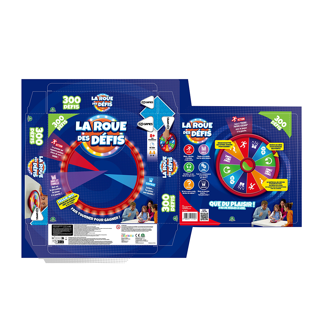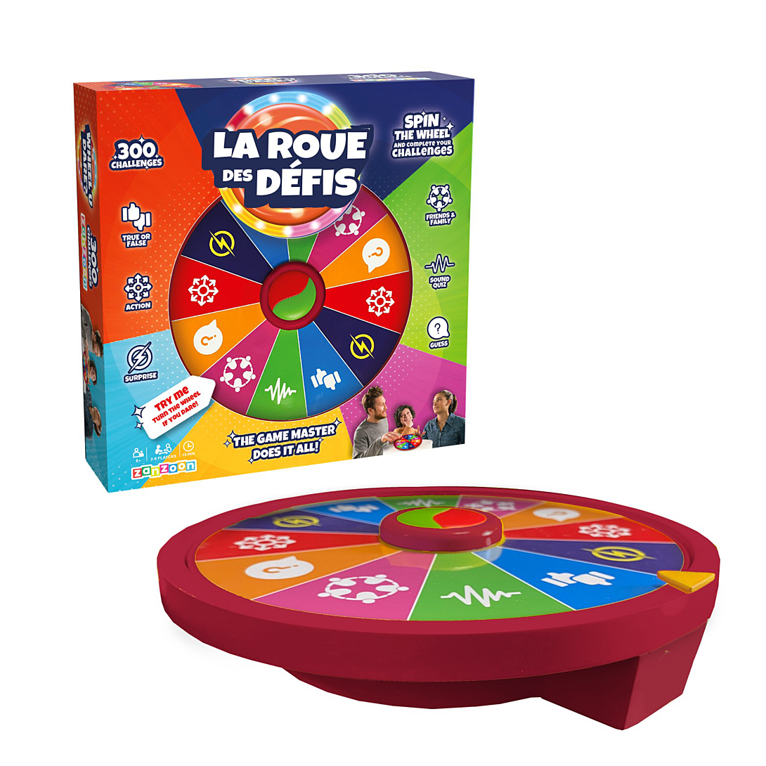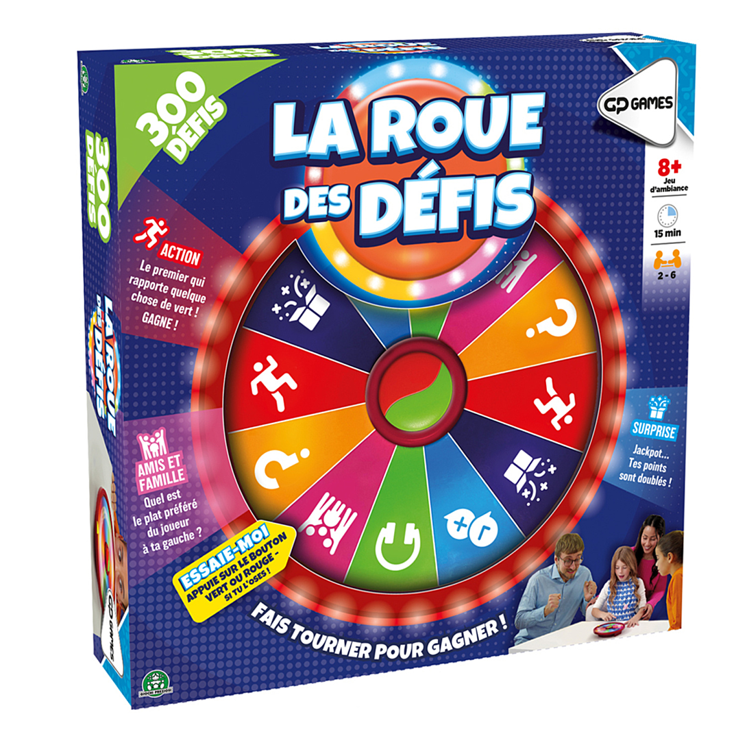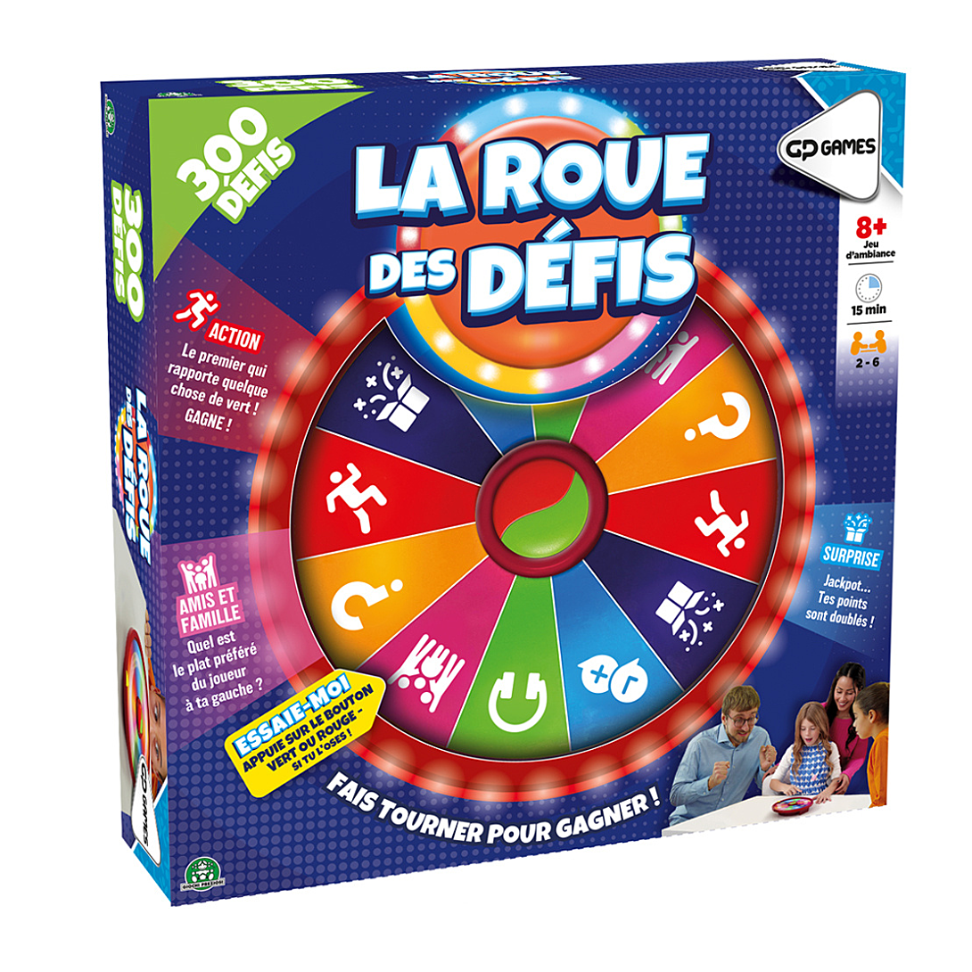 "La roue des défis, 300 défis à réaliser dans 6 catégories différentes : Quiz sur un son, Action, Vrai/Faux, Famille/Amis, Devinette, Surprise. Lance la roue pour découvrir ton défis et marque un max de points. Idéal pour réunir la famille, le système s'occupe de tout : annoncer les défis et compter les points. De 2 à 6 joueurs. Durée de 15 à 20 min A partir de 8 ans"