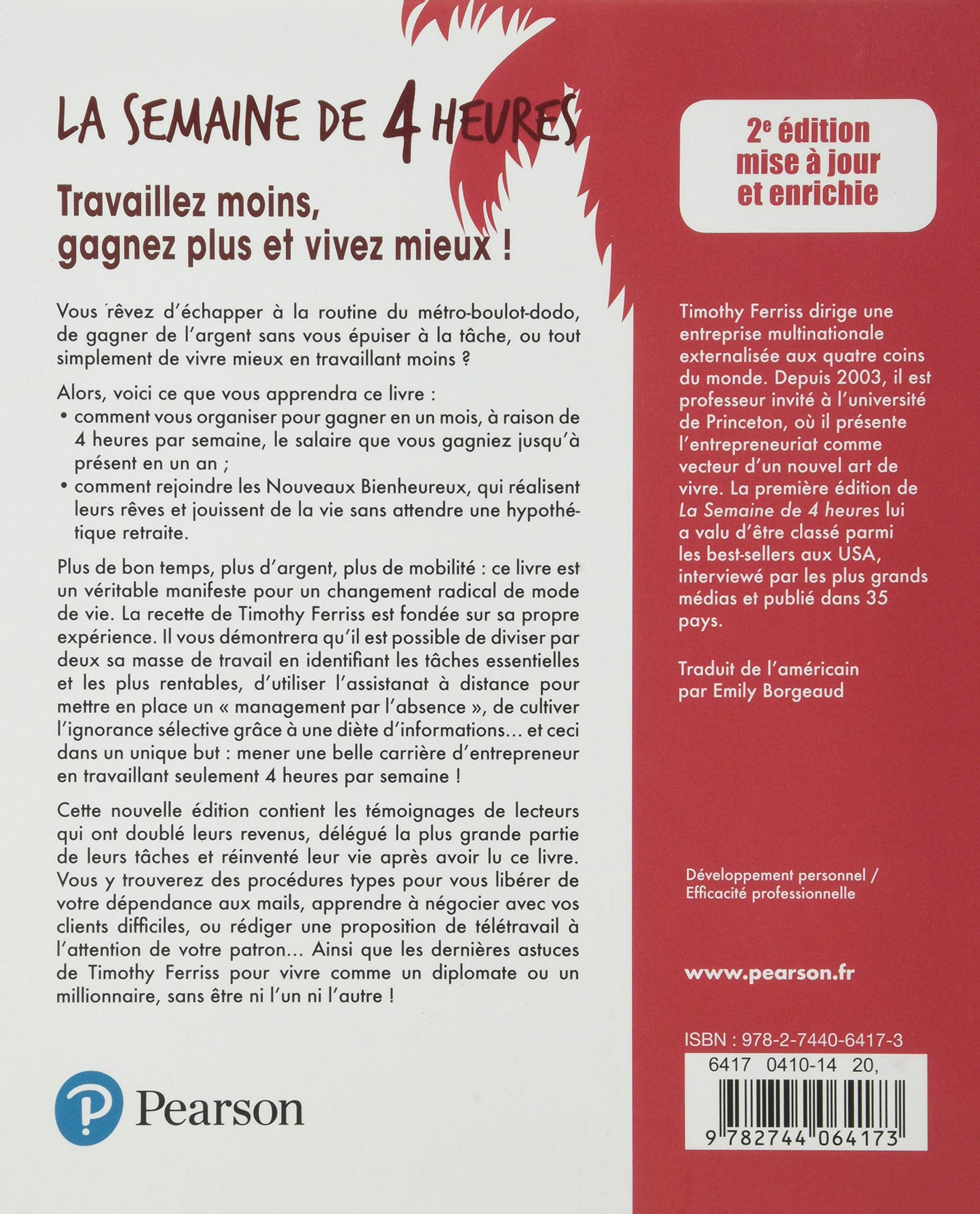 Plus de bon temps, plus d'argent, plus de mobilité : ce livre est un véritable manifeste pour un changement radical de mode de vie. La recette de Timothy Ferriss est fondée sur sa propre expérience. Il vous démontrera qu'il est possible de diviser par deux sa masse de travail en identifiant les tâches essentielles et les plus rentables, d'utiliser l'assistanat à distance pour mettre en place un « management par l'absence », de cultiver l'ignorance sélective grâce à une diète d'informations... et ceci dans un unique but : mener une belle carrière d'entrepreneur en travaillant seulement 4 heures par semaine !