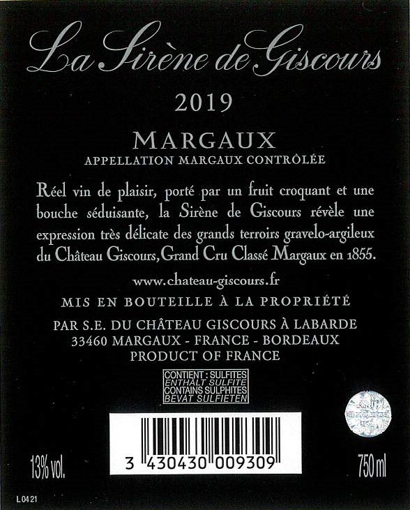 | Libellé | La Sirène de Giscours, 2019 - Margaux A.O.C. - Rouge - 75 cl |