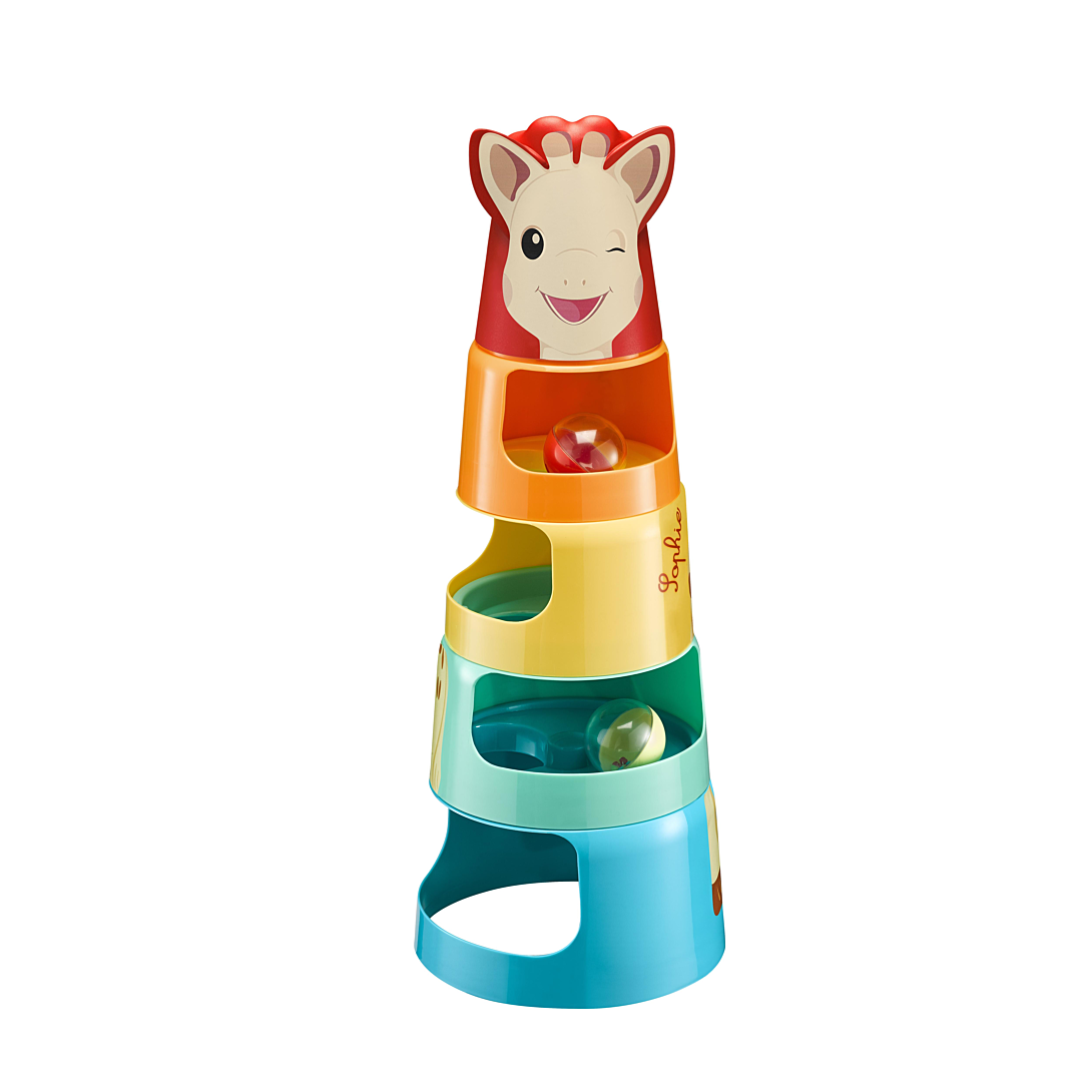 Un incontournable de l’éveil 3 en 1 ! A découvrir : Jeu de construction : 5 pièces à empiler, de la plus grande à la plus petite, permettant de développer la dextérité et la motricité fine de bébé. Un puzzle : bébé s’amuse à reconstituer Sophie la girafe en alignant les différentes parties de son corps (tête, cou, pattes…). Jeu de balles : 2 balles avec des billes à placer au sommet de la tour et qui dévalent les étages un par un grâce au toboggan magique, pour le plus grand bonheur de bébé.