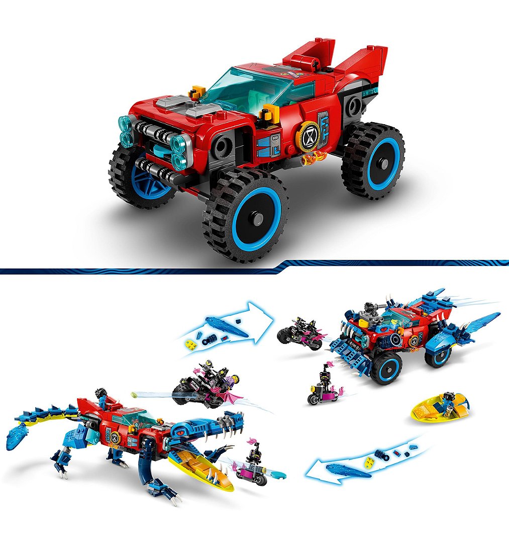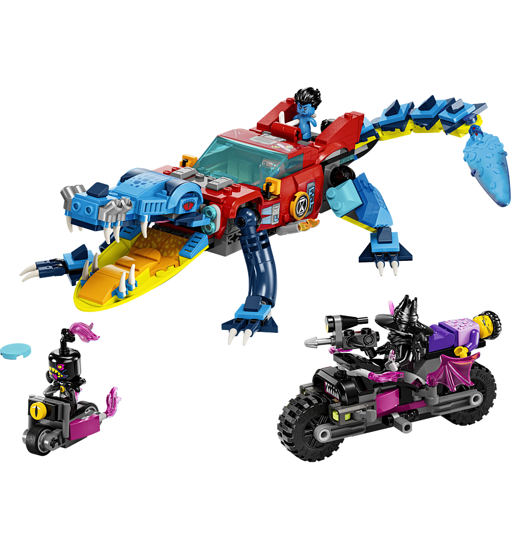 L'ensemble LEGO DREAMZzz comprend 2 options de construction et de nombreuses instructions guidées par l'histoire pour un jeu imaginatif, encourageant les enfants à choisir leur propre aventure et à profiter de deux fois plus de temps de jeu. Ils peuvent décider de construire une voiture crocodile pour combattre les cauchemars ou un tout-terrain LEGO super rapide et un mini-bateau pour les poursuivre. En mode crocodile, le véhicule a des bras et des jambes amovibles et un lanceur de disques caché dans la calandre pour que les enfants puissent tirer des disques de la bouche du crocodile. En mode camion, le camion monstre a des roues qui roulent et un toit amovible pour qu'une minifigurine puisse s'asseoir à l'intérieur. Le jeu de construction comprend une figurine LEGO DREAMZzz Logan, les minifigurines Cooper et Jayden, ainsi que le chasseur nocturne, qui est accompagné d'une moto cool et d'un assistant maléfique.