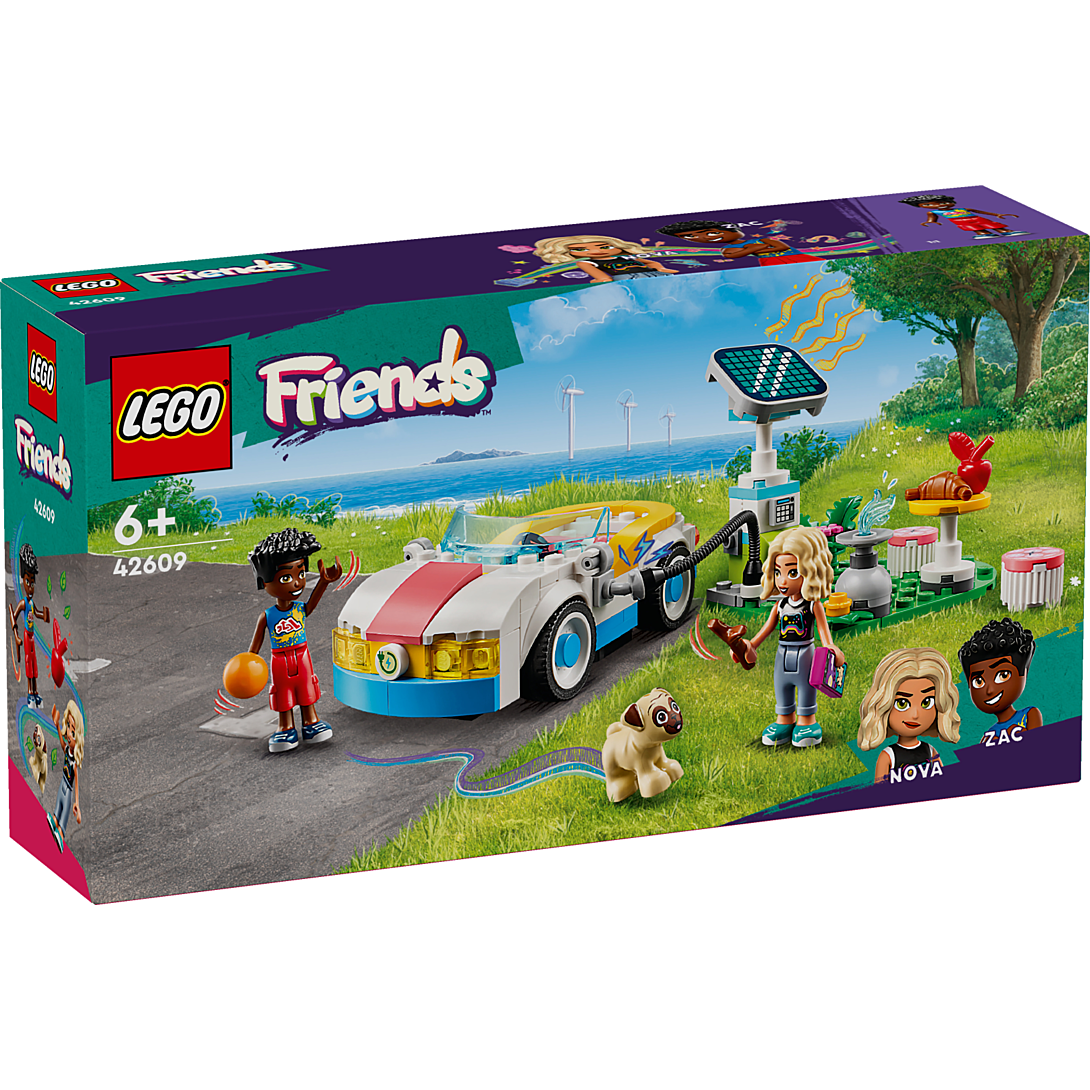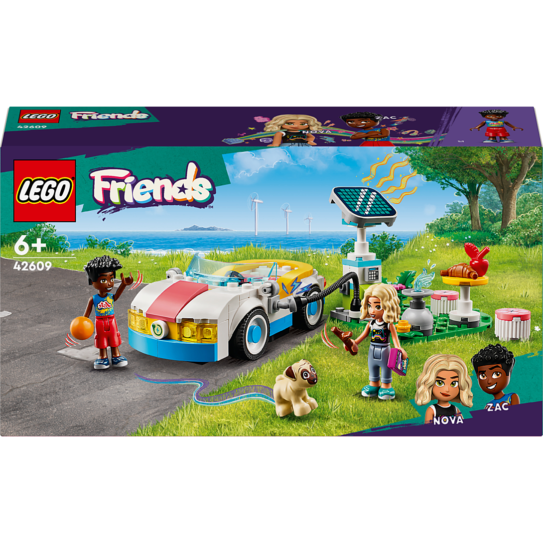 La boîte contient • Set de construction LEGO® Friends La voiture électrique et la borne de recharge – Ce set de véhicule pour filles et garçons dès 6 ans inclut 2 mini-poupées, un chien, une voiture et une borne de recharge solaire• Voiture à construire – La voiture possède des sièges pour les mini-poupées et pour Dango le chien et est dotée d’un coffre qui s’ouvre pour ranger des accessoires• Borne de recharge – Le set inclut une borne de recharge solaire grâce à laquelle les enfants peuvent jouer à « recharger » la voiture de manière écologique avec Zac et Nova• 2 mini-poupées – Avec le chien et les mini-poupées de Zac et Nova LEGO® Friends inclus, le jeu créatif peut commencer sans attendre• De multiples accessoires – Ce jouet pour enfants s’accompagned’accessoires, comme une table, 2 chaises, des téléphones, un bâton, une balle, une pomme, un croissant et une gamelle• Une belle idée de cadeau pour enfants – Ce jouet LEGO® est un beau cadeau à offrir à des garçons et des filles qui aiment l’aventure et raconter des histoires• Sets LEGO® Friends pour filles et garçons – Découvrez les autres jouets de construction créative de la gamme LEGO Friends (vendus séparément) conçus pour les enfants qui aiment mettre en scène des histoires d’amitié• Dimensions – Un set de 170 pièces avec une voiture électrique à construire qui mesure plus de 4 cm de haut, 12 cm de long et 6 cm de large
