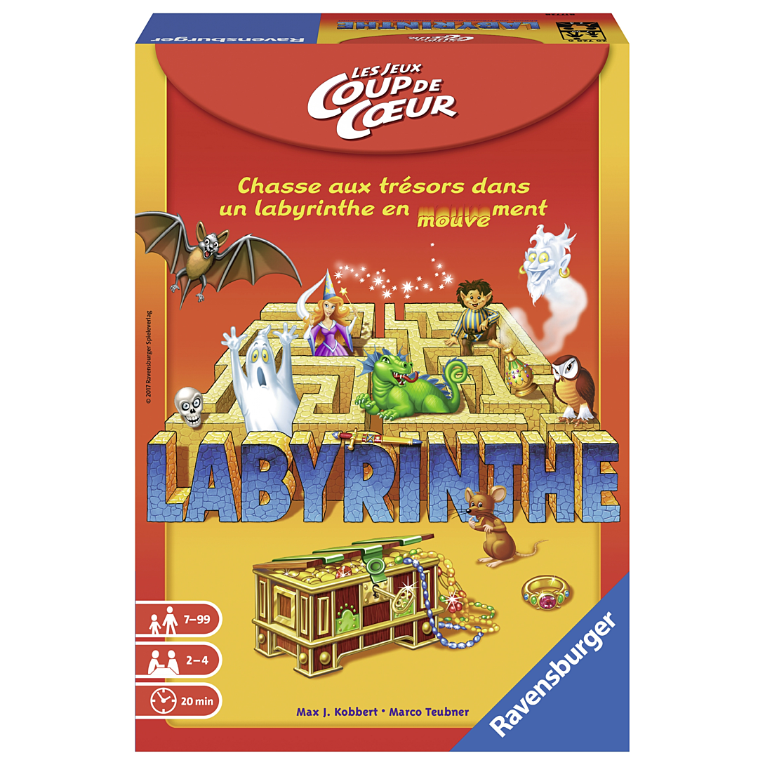 | Plus produit | UN GRAND CLASSIQUE des jeux familiaux ! Depuis sa création en 1986, Labyrinthe enthousiasme petits et grands et a su s\'imposer comme un grand classique du jeu de société ! Participez à une incroyable chasse aux trésors dans un labyrinthe en mouvement dans cette version compacte et petit prix ! VERSION COUP DE CUR : Vous adorez Labyrinthe ! Vous en voulez toujours plus et où que vous alliez ? Grâce à la version Coup de Cur, Labyrinthe vous suivra partout. Avec son petit format de boîte, relevez les défis en jouant directement dans la boîte ! Glissez-le dans votre sac et jouez où que vous soyez ! DES RÈGLES SIMPLES : Poussez astucieusement les couloirs pour vous créer un chemin, déplacez votre figurine et soyez le premier à atteindre vos obejctifs ! Mais attention, vos adversaires parcourent également le labyrinthe et se feront un malin plaisir de vous bloquer ! Un jeu de réflexion plein de rebondissements pour toute la famille ! PARTIES COURTES ET DIFFÉRENTES : le labyrinthe évolue sans cesse et ne demande quà être exploré ! Amusez-vous à créer des dédales toujours différents pour des parties à l\'infini ! Retrouvez également votre Labyrinthe en format classique avec Harry Potter, Pokémon, Disney Villains et vos autres personnages préférés ! " Contenu: 1 plateau de jeu, 35 cartes Couloir, 16 jetons Trésor, 16 cartes Aide, 4 pions, 1 règle de jeu. Se joue dans la boîte. De 2 à 4 joueurs et à partir de 7 ans. Une partie dure en moyenne 20 minutes. Vous en voulez plus ? Retrouver les autres jeux classiques en version petit prix : Croque-Carotte, Qui l\'a vu ?, Ramsès et Rush Hour." |