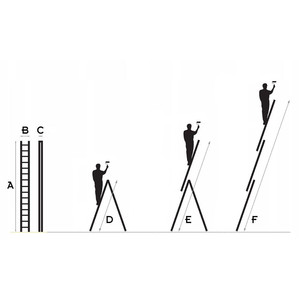 3 x 7 marches : A : 1,90 m / B : 46 cm / C : 13 cm / D : 1,90 m / E : 2,70 m / F : 3,25 m / Poids 9,1 kg.