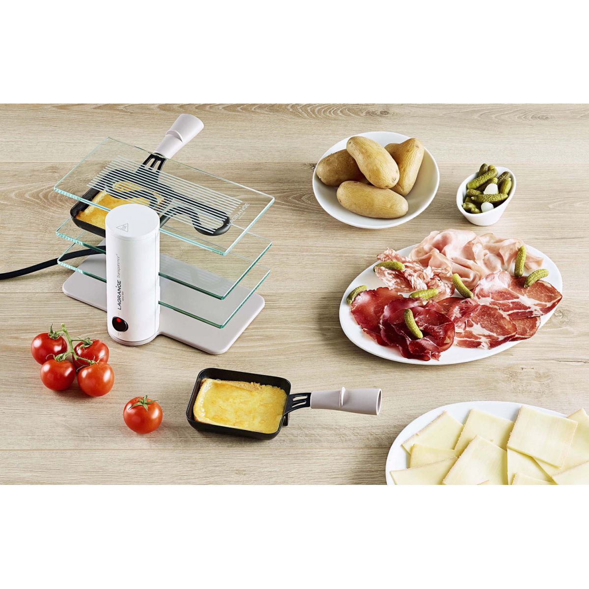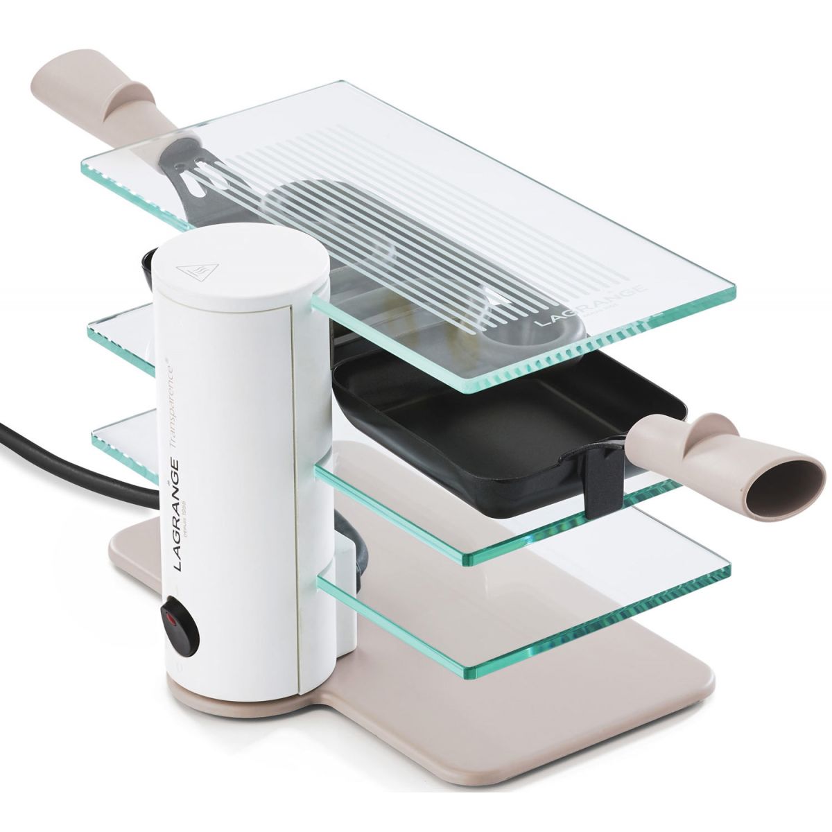 Libellé LAGRANGE Appareil à raclette 350W Gris perlé/Transparent 2 personnes 2 poêlons 3 plateaux verre trempé