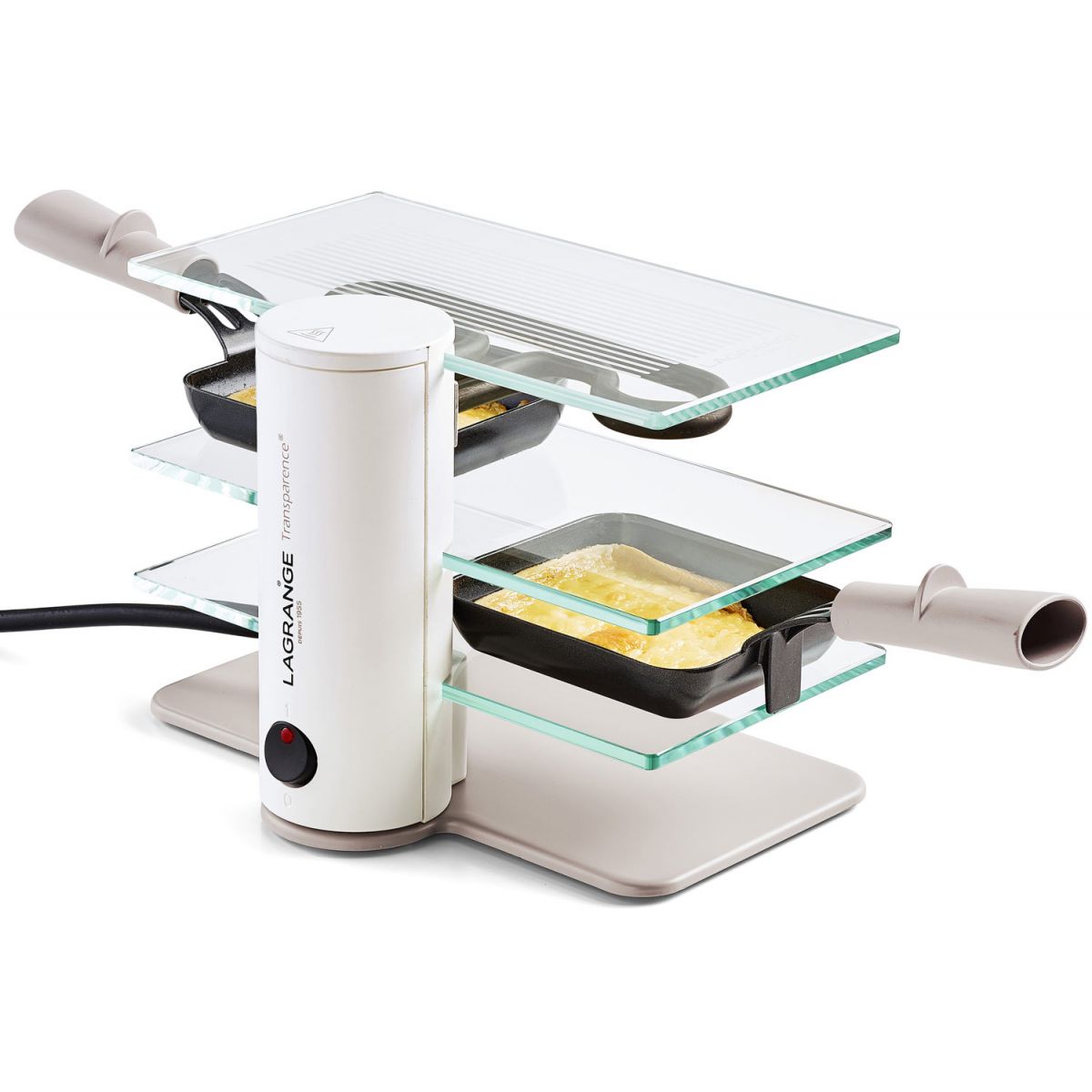 Astucieux, les 3 plateaux en verre trempé ultra résistants permettent à chacun de suivre parfaitement la cuisson du fromage et de retirer le poêlon dès que le fromage est à votre convenance.