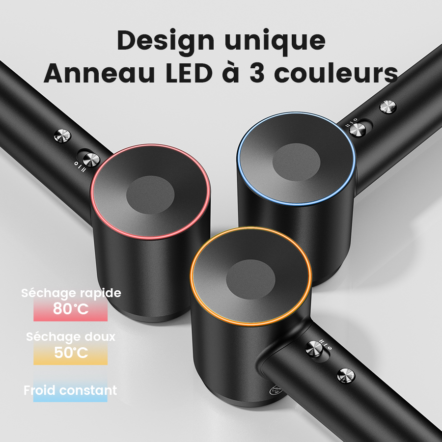 [Anneau lumineux à LED 3 couleurs et faible niveau sonore]Un design unique du sèche-cheveux. Vous pouvez transformer l'anneau led en différentes couleurs en changeant le bouton de chaleur. Le rouge indique un air chaud à 80 degrés, le jaune un air chaud à 50 degrés, et le bleu un air froid. Appuyez et maintenez 2s pour activer le mode de circulation, en changeant l'air chaud et froid toutes les quelques secondes. Le bruit du sèche-cheveux Laifen n'est que de 59dB en fonctionnement et ne perturbera pas le repos de votre famille.