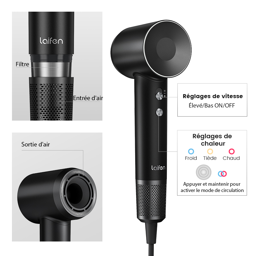 | Libellé | Laifen Sèche-cheveux negative Ions haute vitesse et séchage rapide - noir/1.8m - 1600W/110,000RPM - 3 Vitesses |