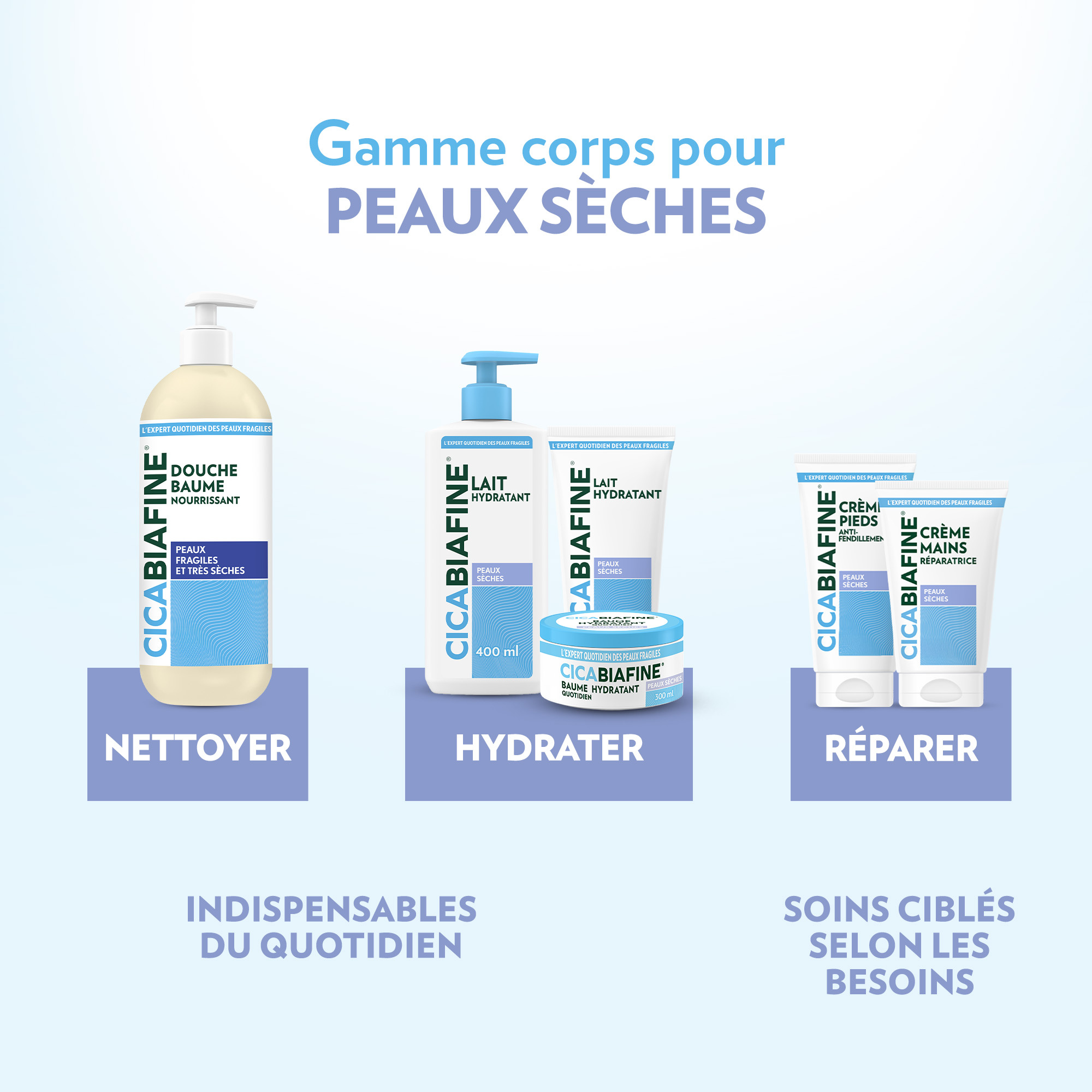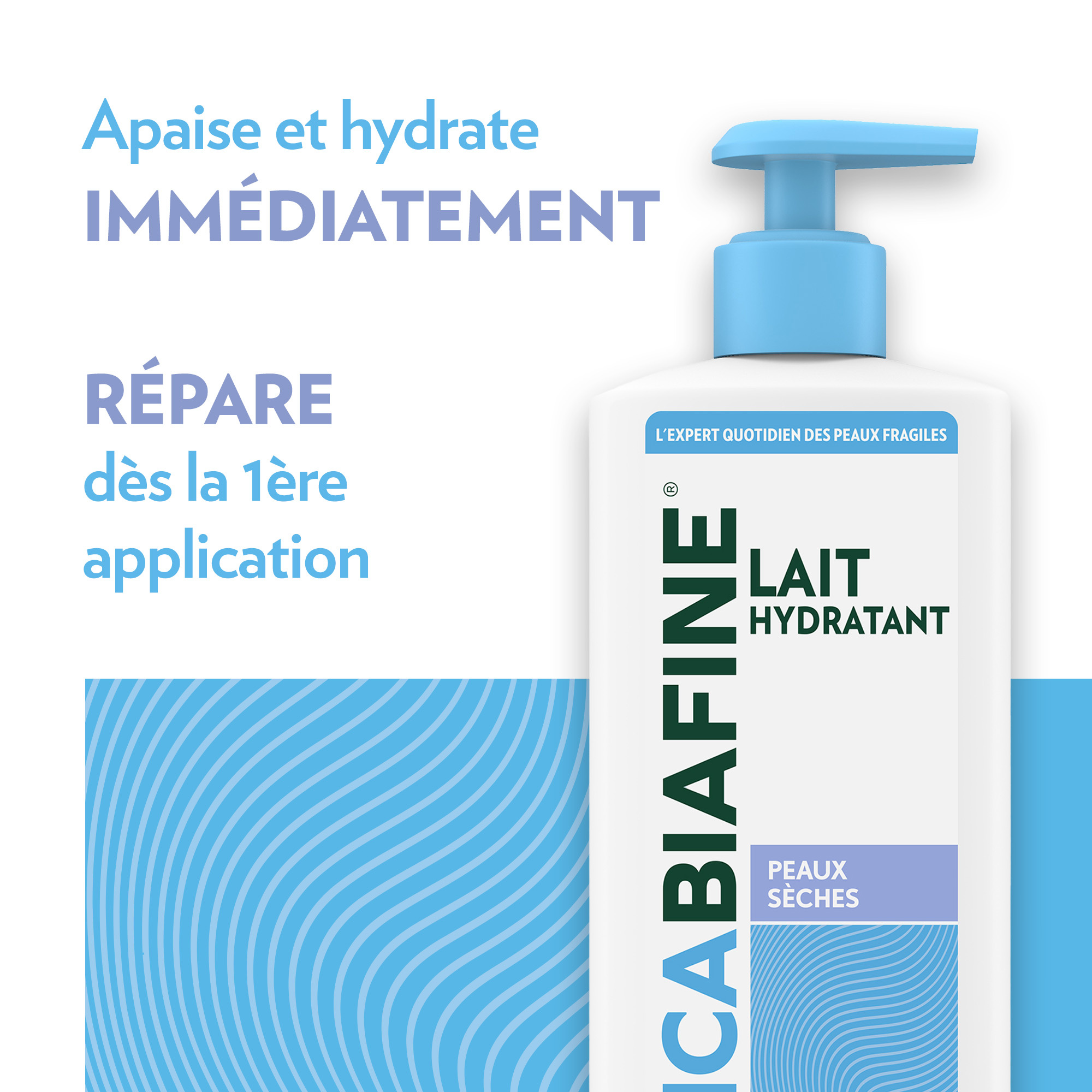 Le Lait Hydratant Corporel Quotidien Cicabiafine répare les peaux sèches et abîmées. Il convient aux peaux sensibles de toute la famille*, particulièrement aux peaux sèches, tiraillées ou rugueuses, qu’elles soient d’origine constitutionnelle (naturellement sèches) ou provoquées par des agressions extérieures (vent, froid, chauffage, eau calcaire...). Sa formule enrichie en acide hyaluronique, actif reconnu par des médecins pour ses propriétés réparatrices**: elle apaise et hydrate*** dès la 1ère application, favorise la réparation de la peau et la rend douce et souple. Ce produit hypoallergénique****, à la texture légère et onctueuse, a été développé sous contrôle médical et testé cliniquement. * Enfants à partir de 3 ans ** Etude TNS Healthcare, 150 médecins, France, août 2008 *** Hydratation des couches supérieures de l'épiderme **** Formulé pour minimiser les risques d'allergies.