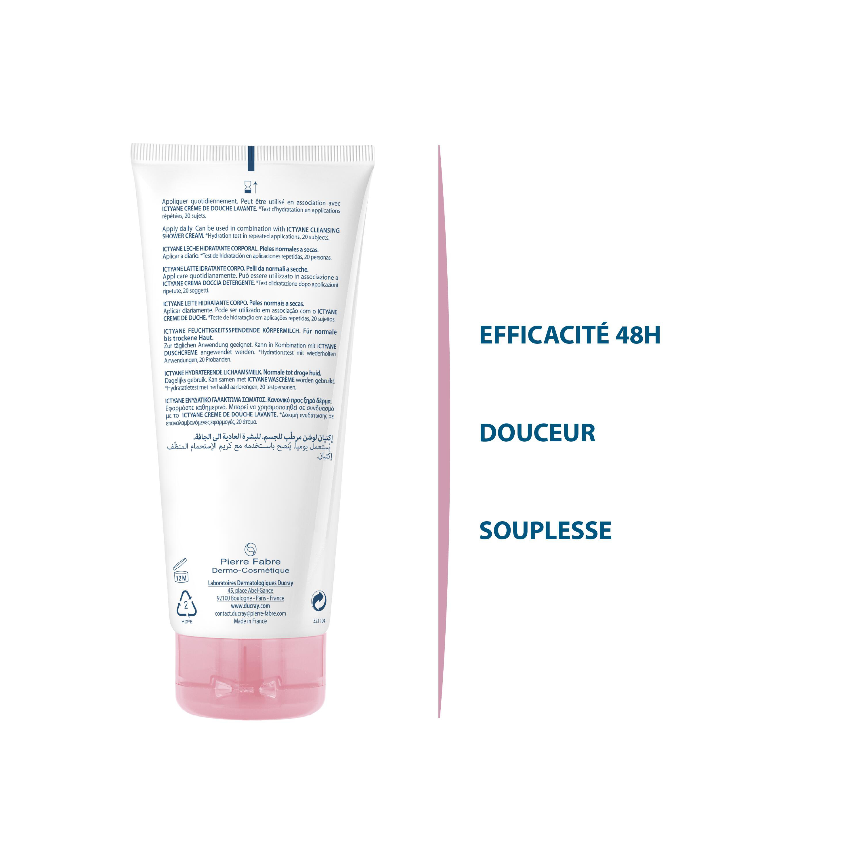 Ducray Ictyane Lait Hydratant Corps 200 ml est un lait pour le corps d'une efficacité durable de 48 heures spécialement formulé pour apporter souplesse et douceur aux peaux normales à sèches. Sa formule délicatement parfumée préserve la barrière cutanée et protège la peau de la déshydratation. Enrichie d'un complexe intelligent combinant Acéfylline et huile d'Abyssinie, elle permet de réactiver les processus naturels d'hydratation et de nutrition de la peau. Celle-ci retrouve souplesse et confort. Sa texture non non grasse et non collante permet un habillage immédiat.