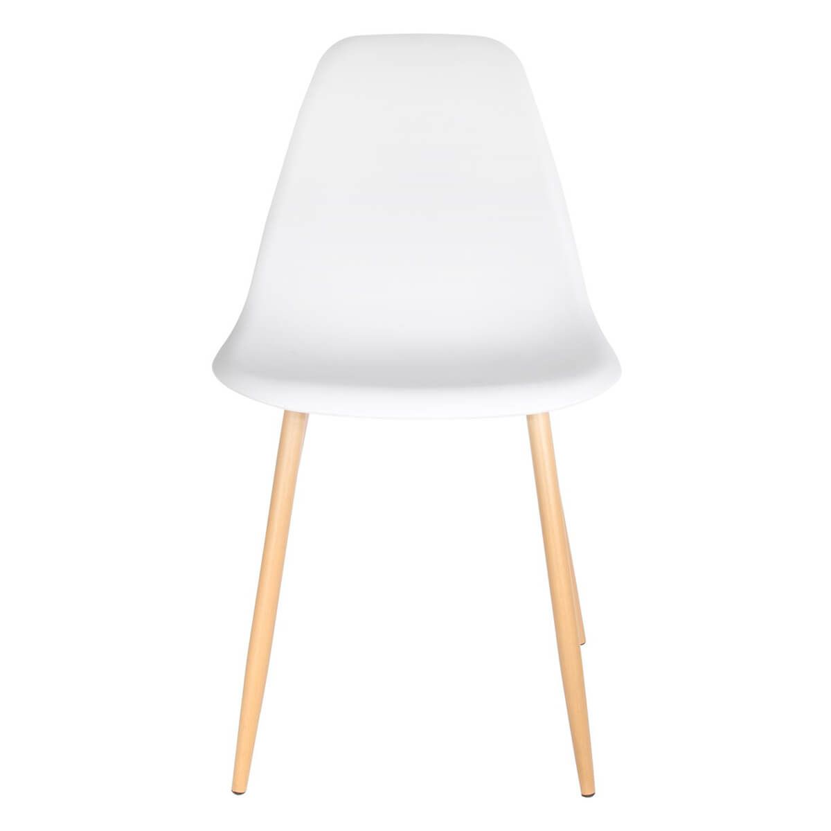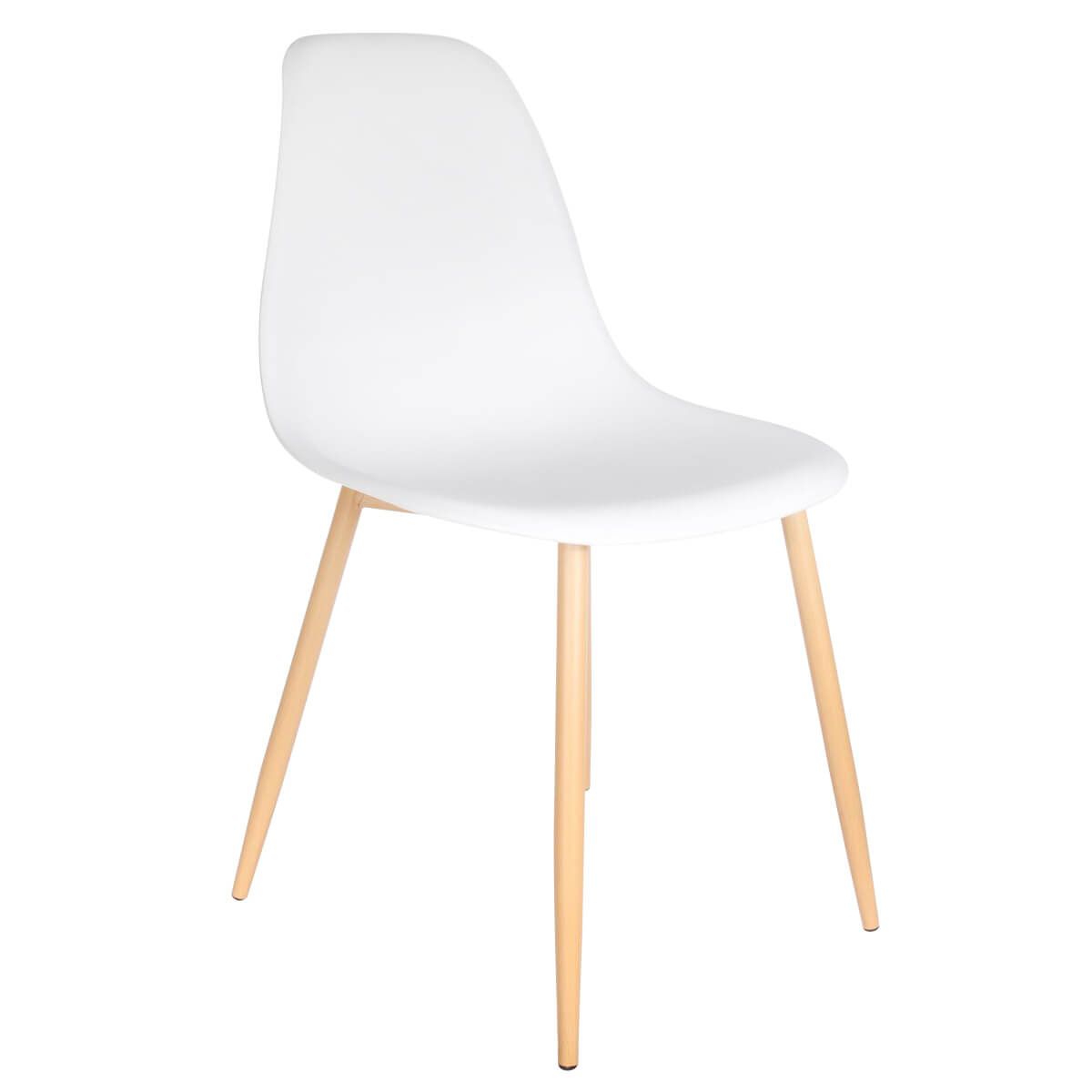 Piétement en fer, finition revêtement aspect bois. Assise et dossier en polypropylène coloris blanc. Poids maximum conseillé : 100kg.