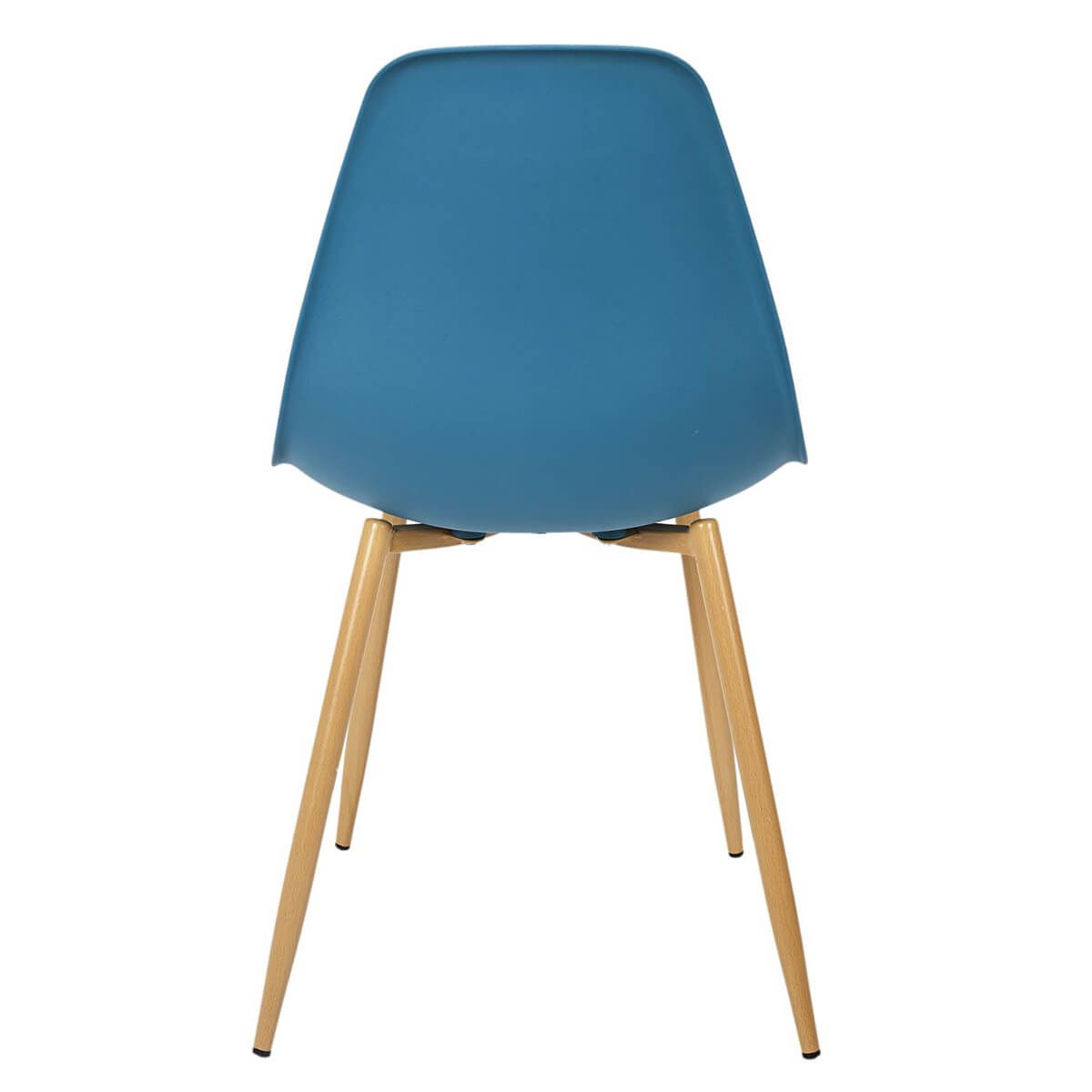 Piétement en fer, finition revêtement aspect bois. Assise et dossier en polypropylène coloris bleu. Poids maximum conseillé : 100kg.