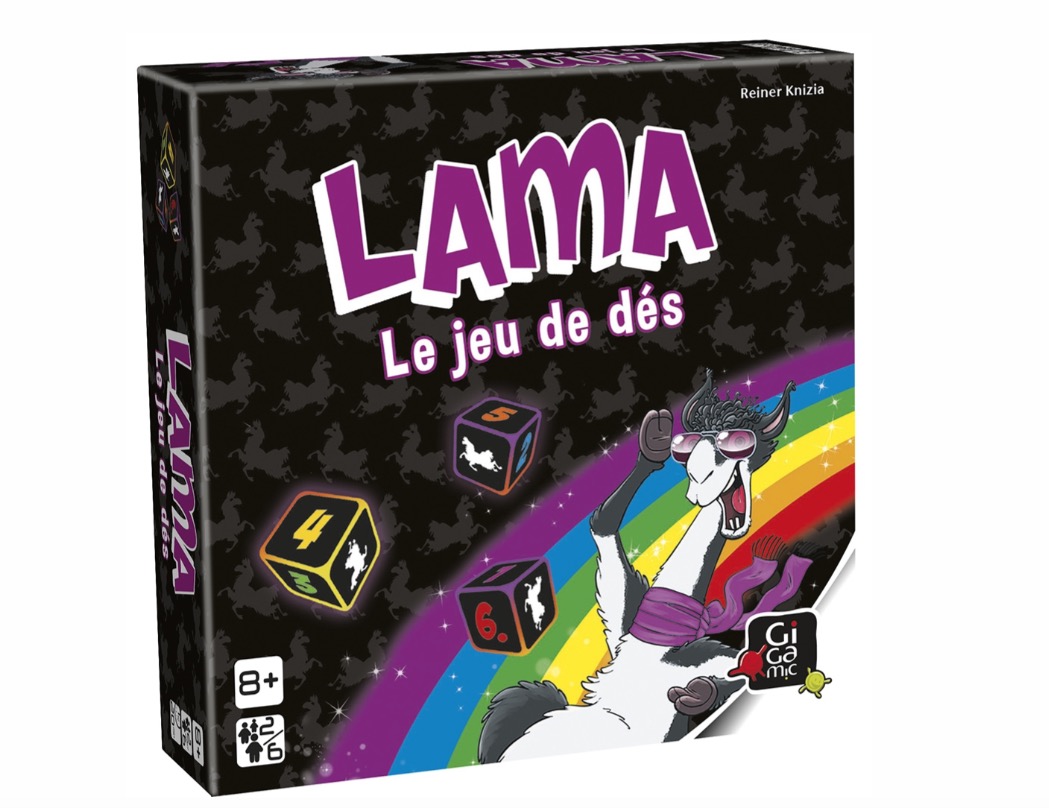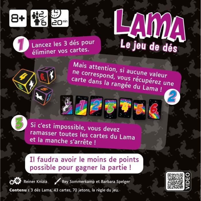 à partir de 8 ans moins de 30 min 2 à 6 joueur(s) Simple et rapide, ambiance assurée!Dans Lama, le jeu de dés, avec le bon lancé, vous pourrez vous débarrasser de vos cartes chiffres ou Lama: pour chaque face qui correspond à une carte que vous possédez, vous pouvez la ou les éliminer. Attention à quitter la partie au bon moment, car les cartes qui vous restent vous feront récupérer des jetons points, et le seul moyen de défausser un jeton est de réaliser un lancé triple Lama! Au bout de quelques manches, le joueur qui dépasse les 40 points met fin à la partie et c'est celui qui a le moins de points qui gagne!.