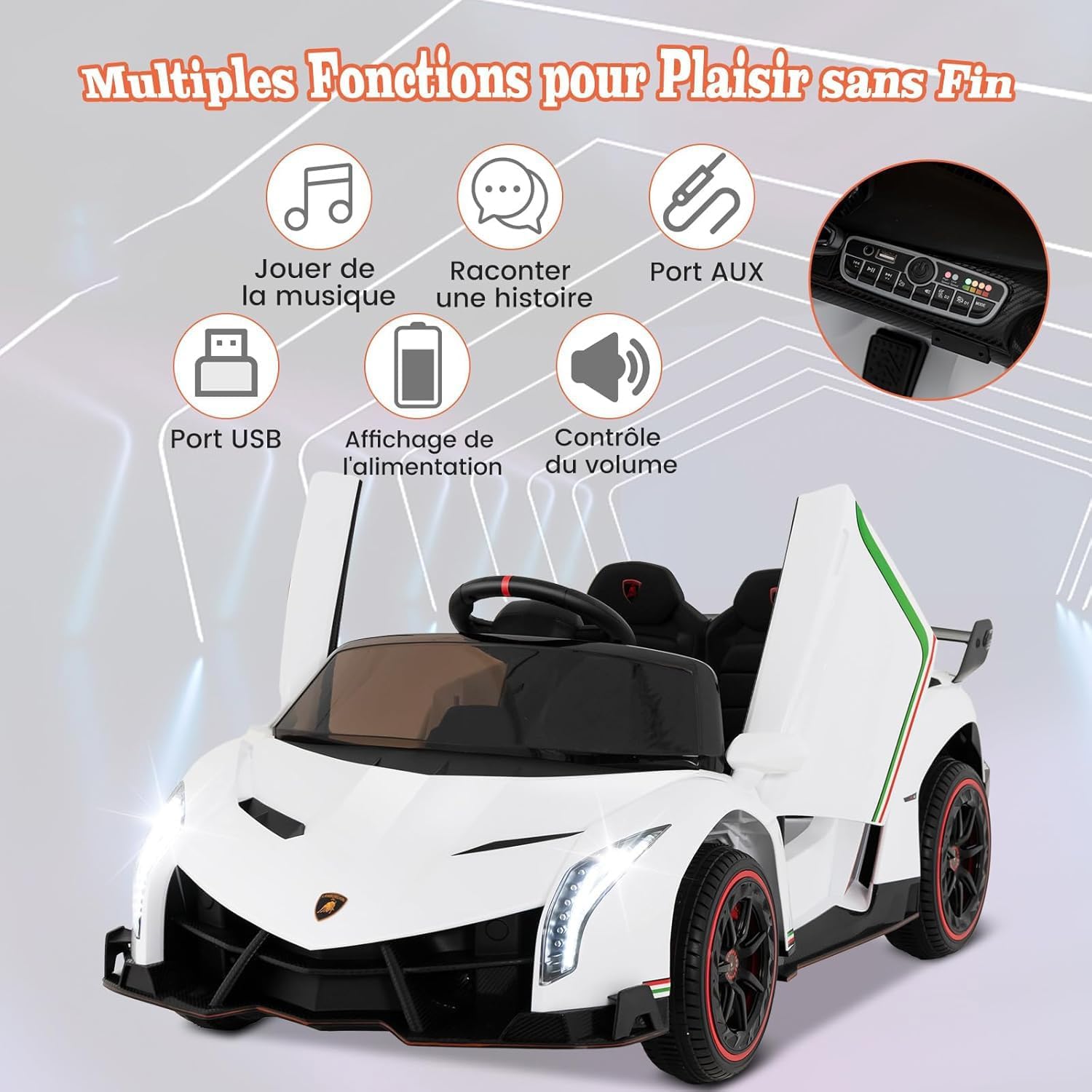 | Libellé | Lamborghini voiture electrique enfants 12v, voiture electrique enfants 1 place avec télécommande blanc |