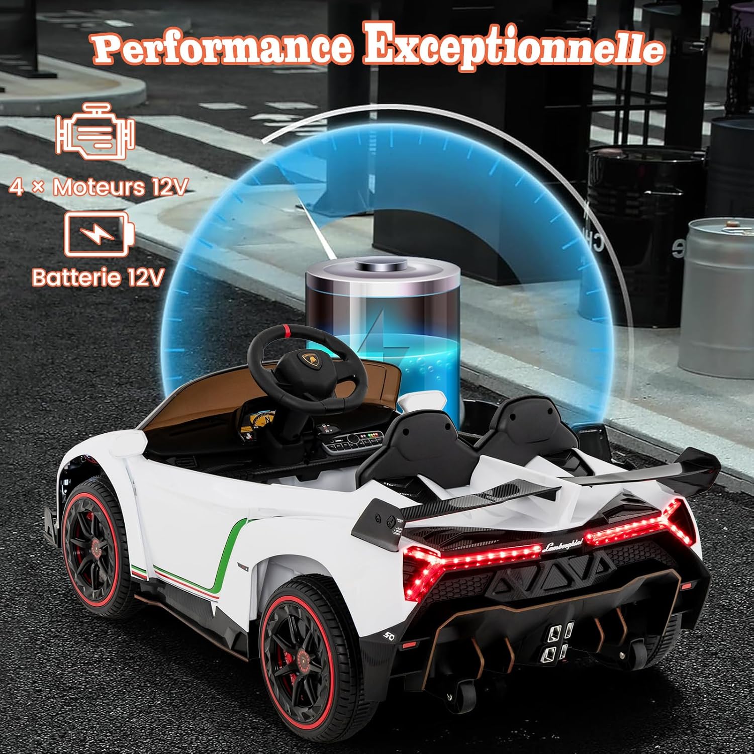 - Voiture sous licence Lamborghini avec 4 moteurs puissants offrant des performances élevées