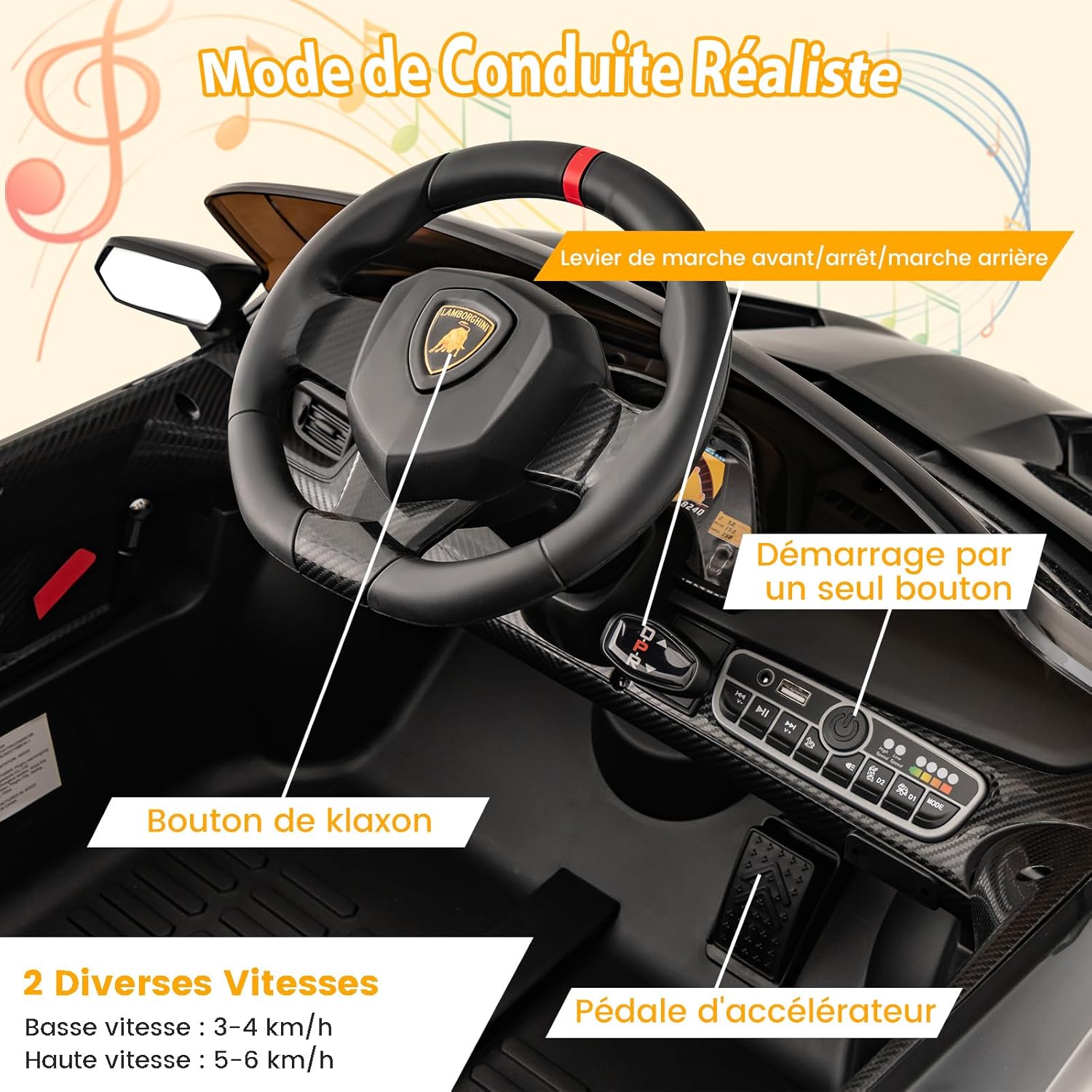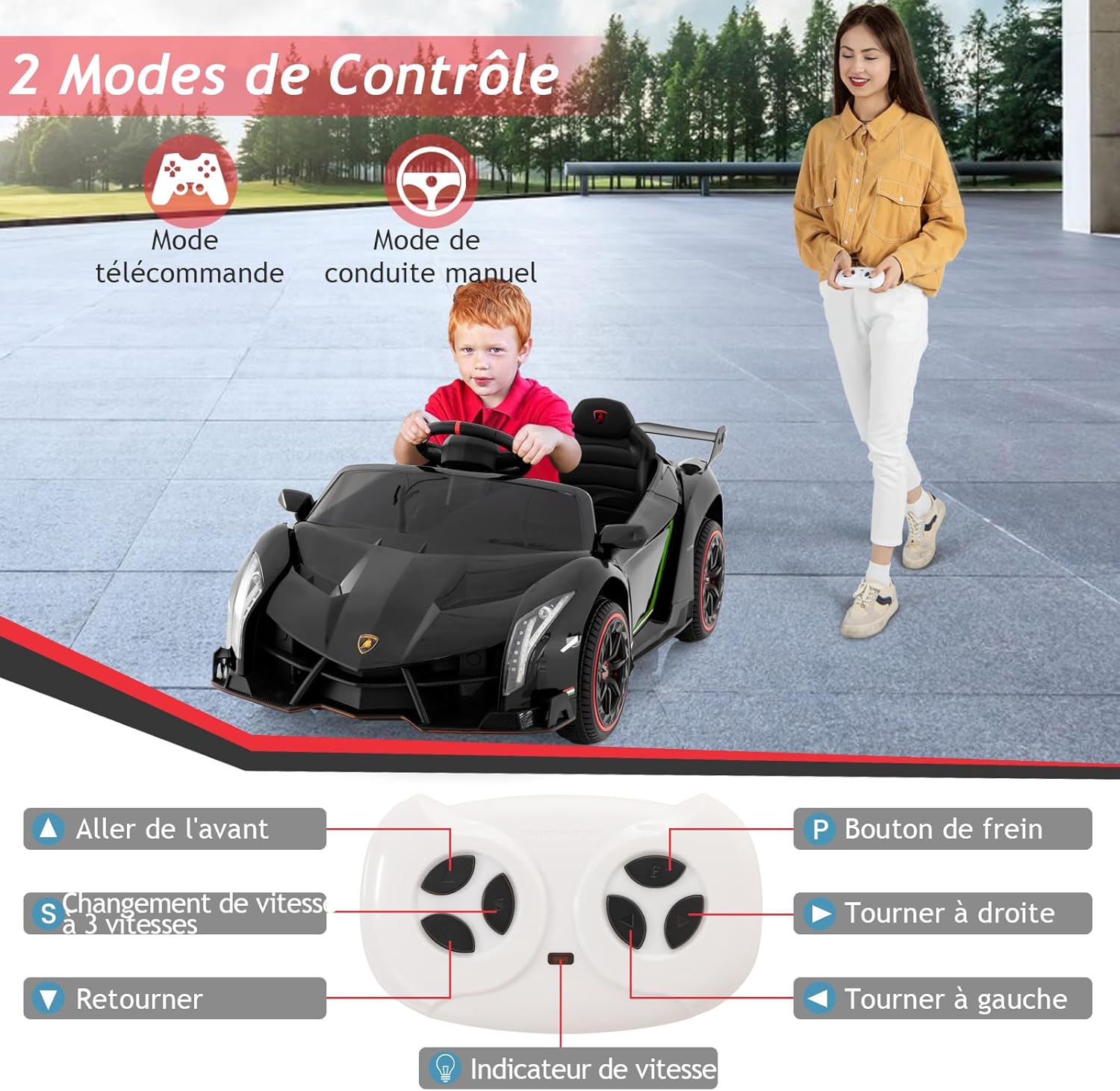 - Selon les réglementations de l'Union européenne, pour la sécurité de votre enfant, pour activer le mode de contrôle à distance, il est obligatoire de basculer entre les deux modes en utilisant le bouton sur la voiture ou sur la télécommande. Un tournevis sera nécessaire pour changer de mode afin que l'enfant ne puisse pas changer de mode facilement.Cette voiture sous licence officielle Lamborghini pour enfants, est élégante et performante. Avec une télécommande 2,4G et une conduite manuelle, elle offre une conduite immersive et personnalisable. Elle dispose d'une fonction de démarrage lent pour une conduite douce et sûre. Les roues antichocs sont durables et permettent de rouler facilement sur diverses surfaces, comme le béton, les trottoirs et les routes goudronnées.
