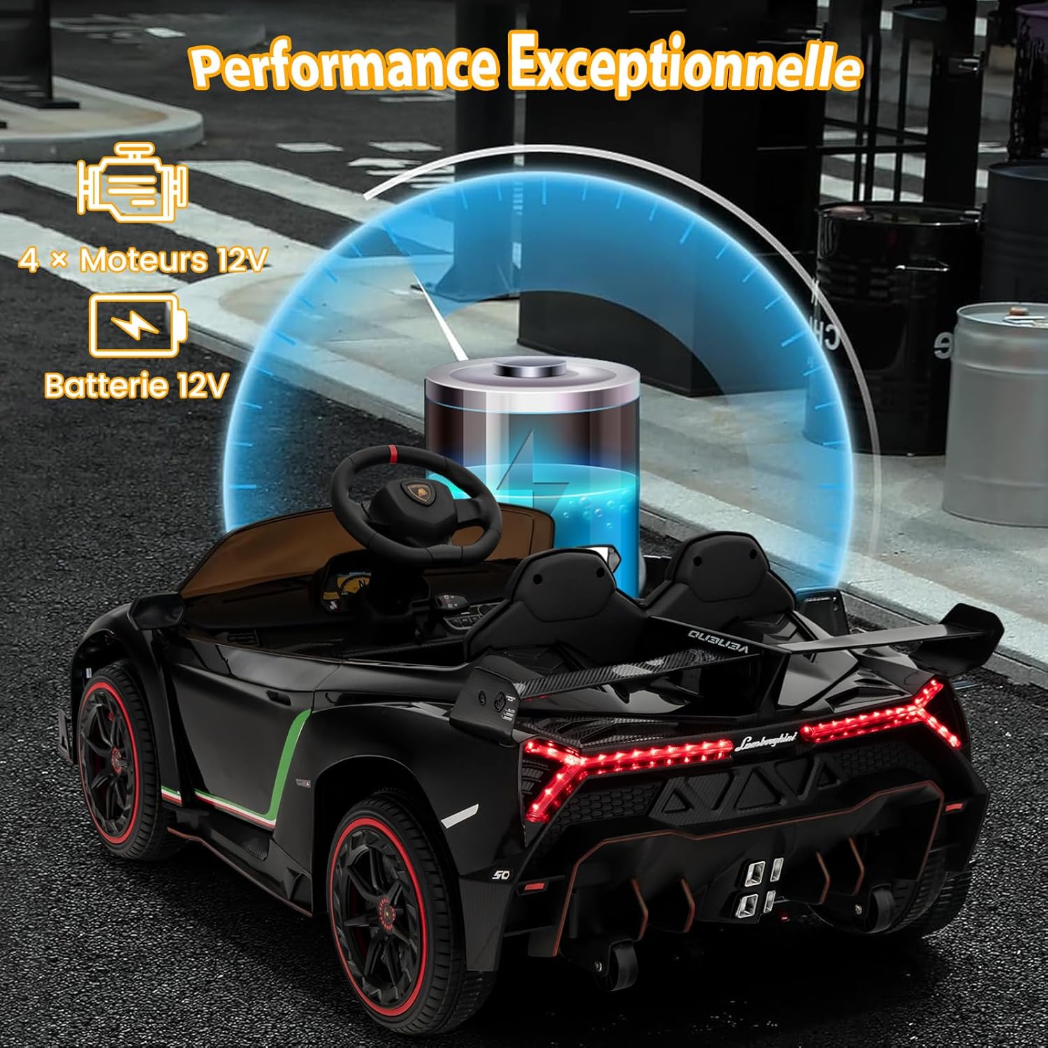 - Voiture sous licence Lamborghini avec 4 moteurs puissants offrant des performances élevées