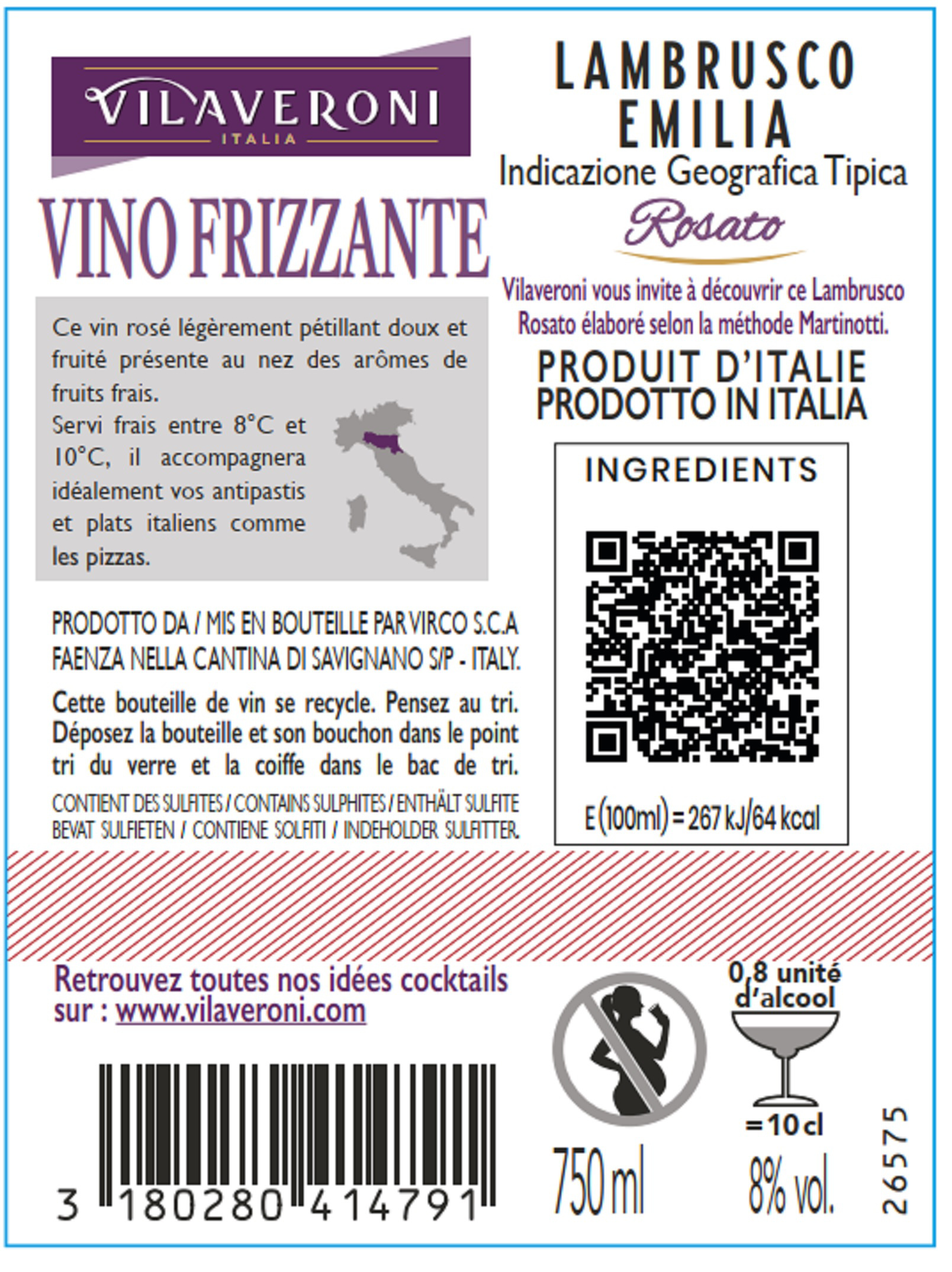 | Libellé | Lambrusco Rosato Vilaveroni, Italie - Brut rosé - 75cl |