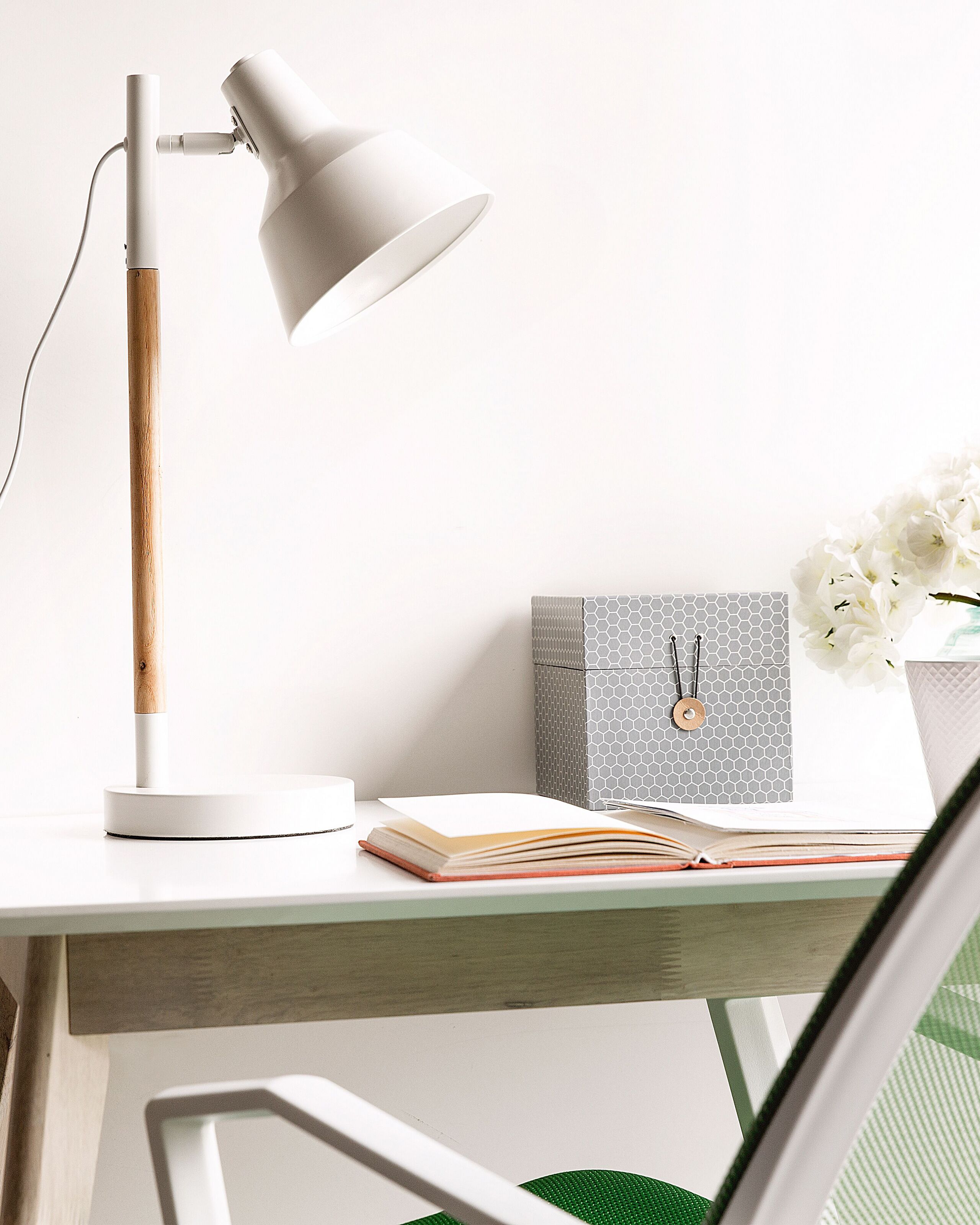 Lampe de bureau à abat-jour réglable. Cette lampe de table classique est minimaliste et apaisante avec sa combinaison de bois de frêne clair et de métal blanc. Un abat-jour réglable soutenu par une base ovale donne une lumière ciblée, parfaite pour travailler ou étudier. Cette pièce épurée et contemporaine constitue une lampe de bureau polyvalente, une lampe de salle à manger ou une lampe de lecture de chevet.