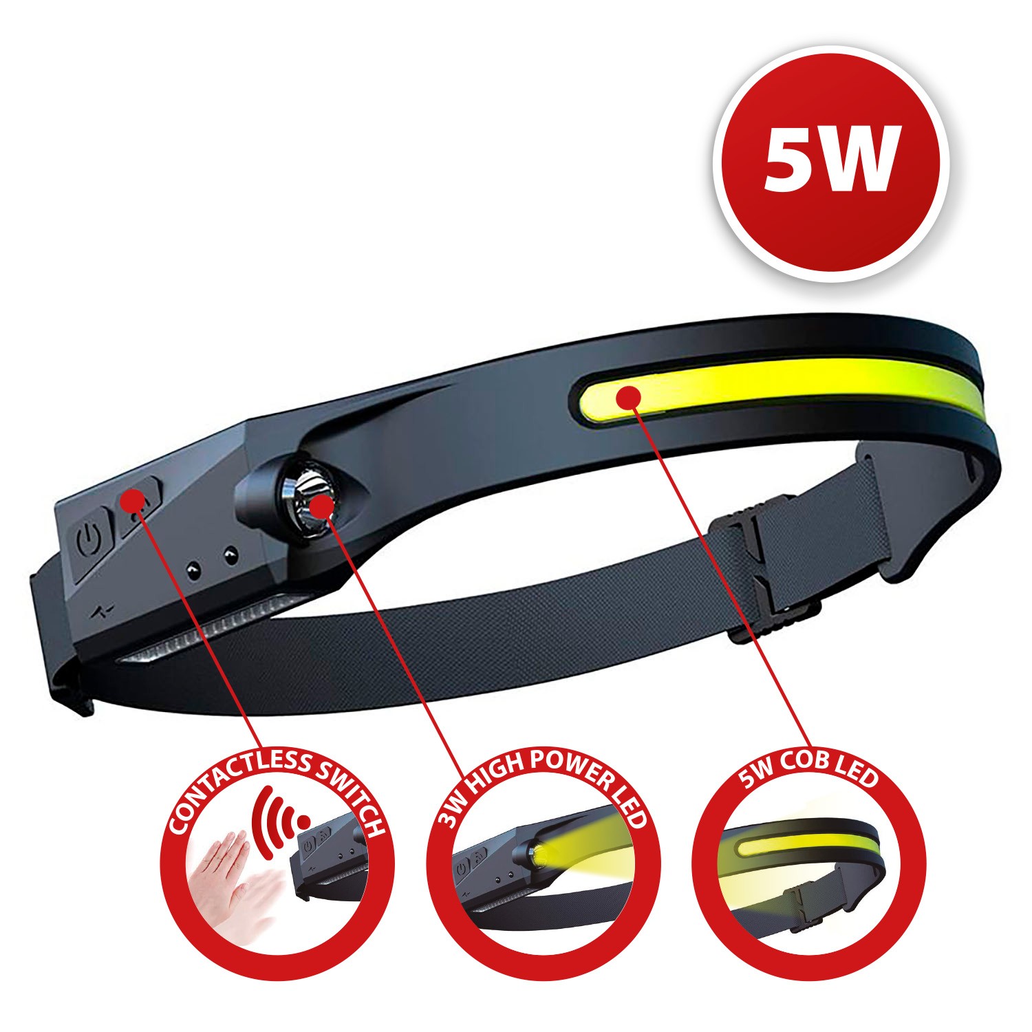 5 modes d'éclairage : la lampe frontale LED dispose de 5 modes d'éclairage : bande COB lumière 100%, bande COB lumière 50%, phare latéral 100%, phare latéral 50%, stroboscope (quel que soit le mode dans lequel vous vous trouviez, appuyez longuement sur le bouton Marche/Arrêt pendant 3 secondes pour le mode stroboscopique : utile en cas d'urgence). Cette lampe frontale satisfera tous vos besoins d'éclairage. C'une lampe frontale très puissante : jusqu'à 350 lumens (bande COB). Détecteur de mouvement et rechargeable par USB : La lampe frontale LED avec détecteur de mouvement est équipée de capteurs qui détectent les mouvements de la main et par conséquent allument/éteignent la lumière facilement sans avoir à toucher l'interrupteur ! Pratique lorsque vos mains sont sales ou occupées. Le câble de charge USB permet de recharger la lampe frontale depuis n'importe quel périphérique USB (chargeur de téléphone portable, powerbank, PC etc... Câble USB inclus). La batterie au lithium est de dernière génération. De bonne capacité (1200mAh), elle vous garantit jusqu'à 5 heures de lumière. Lumière 2 en 1 : éclairage de zone complète et éclairage longue distance. La lampe frontale rechargeable offre 2 types de lumière : 1) avec le bandeau COB vous aurez un éclairage avec un champ de vision de 230 degrés (parfait pour éclairer une large surface) et 2) Avec la torche latérale 'haute puissance' vous aurez un éclairage focalisé et précis à longue distance (80m). Cette fonction 2 en 1 vous permettra de choisir la lumière qui convient le mieux à vos activités. Légère et confortable : le poids de la lampe frontale n'est que de 80 grammes. De plus, l'élastique est facilement réglable, parfait pour ceux qui ont besoin d'un éclairage confortable. La bande en silicone élastique et antidérapante et permet à la lampe frontale de s'adapter facilement aux enfants et aux adultes. Lampe frontale multifonctions: lampe frontale étanche IP44, vous permettant de l'utiliser lorsque vous travaillez ou faites de la randonnée et des activités de plein air, même les jours de pluie ou de neige. Lampe frontale mains libres parfaite pour la course, la marche, la pêche, la chasse, la randonnée, le vélo, la lecture, la spéléologie et les réparations automobiles.