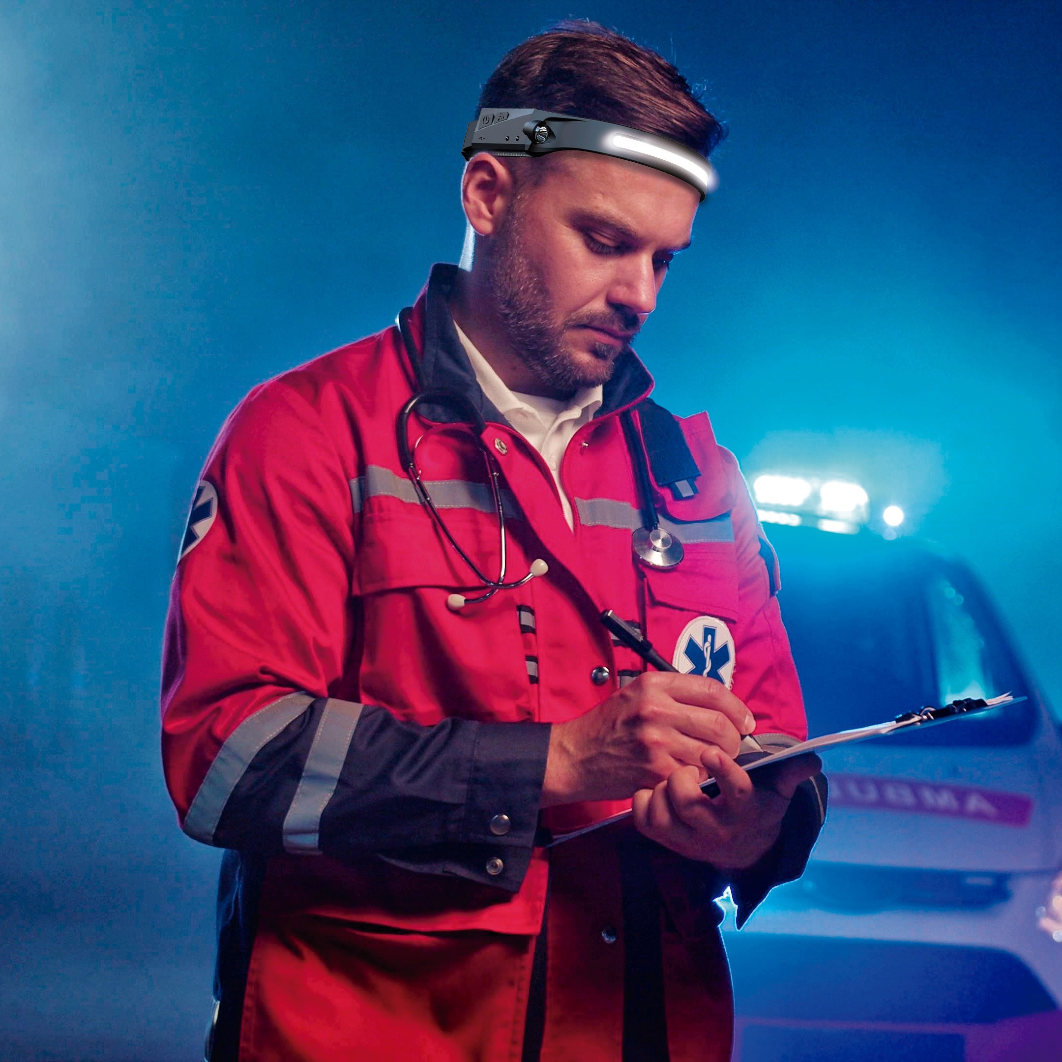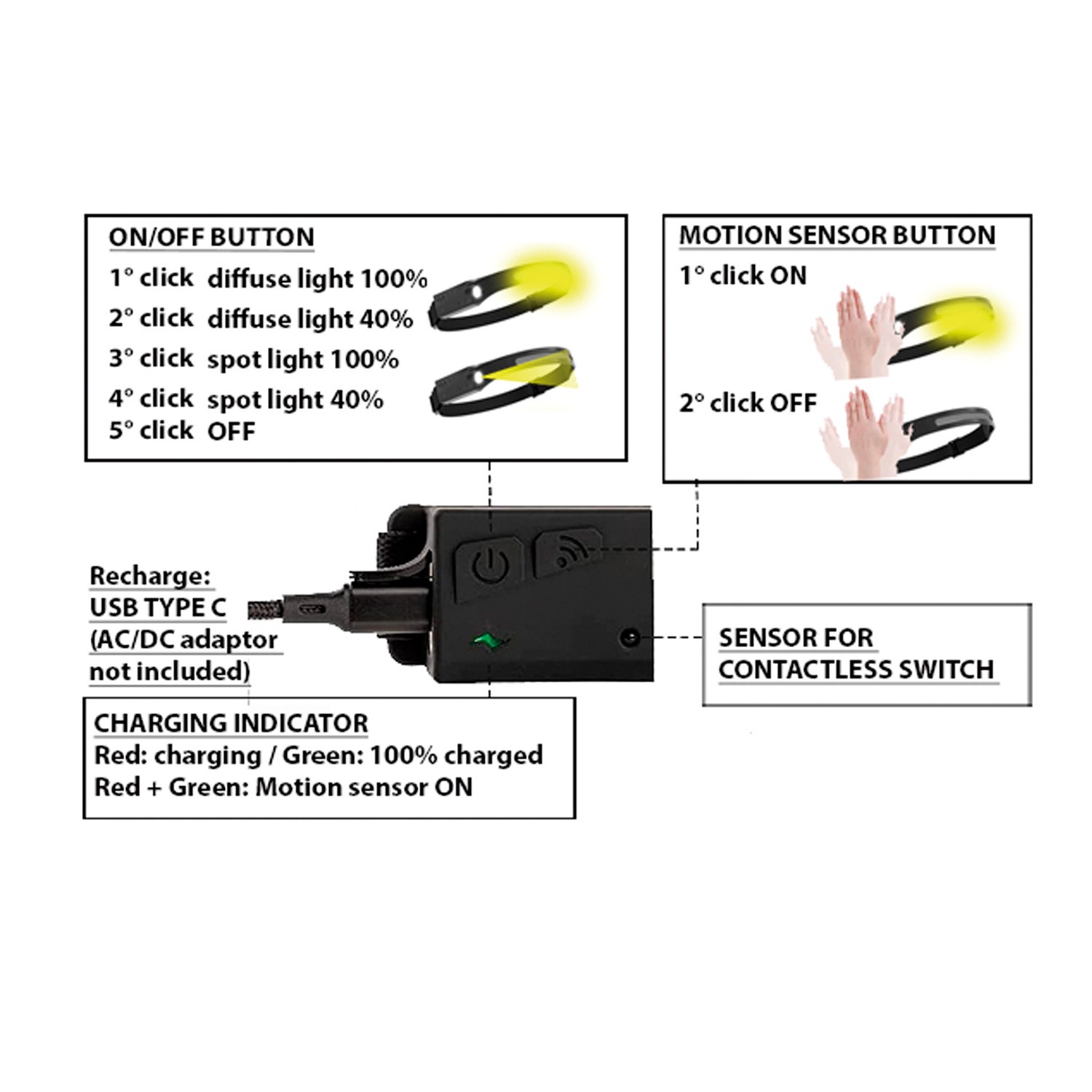 Lampe frontale LED rechargeable 2 en 1 avec détecteur de mouvement