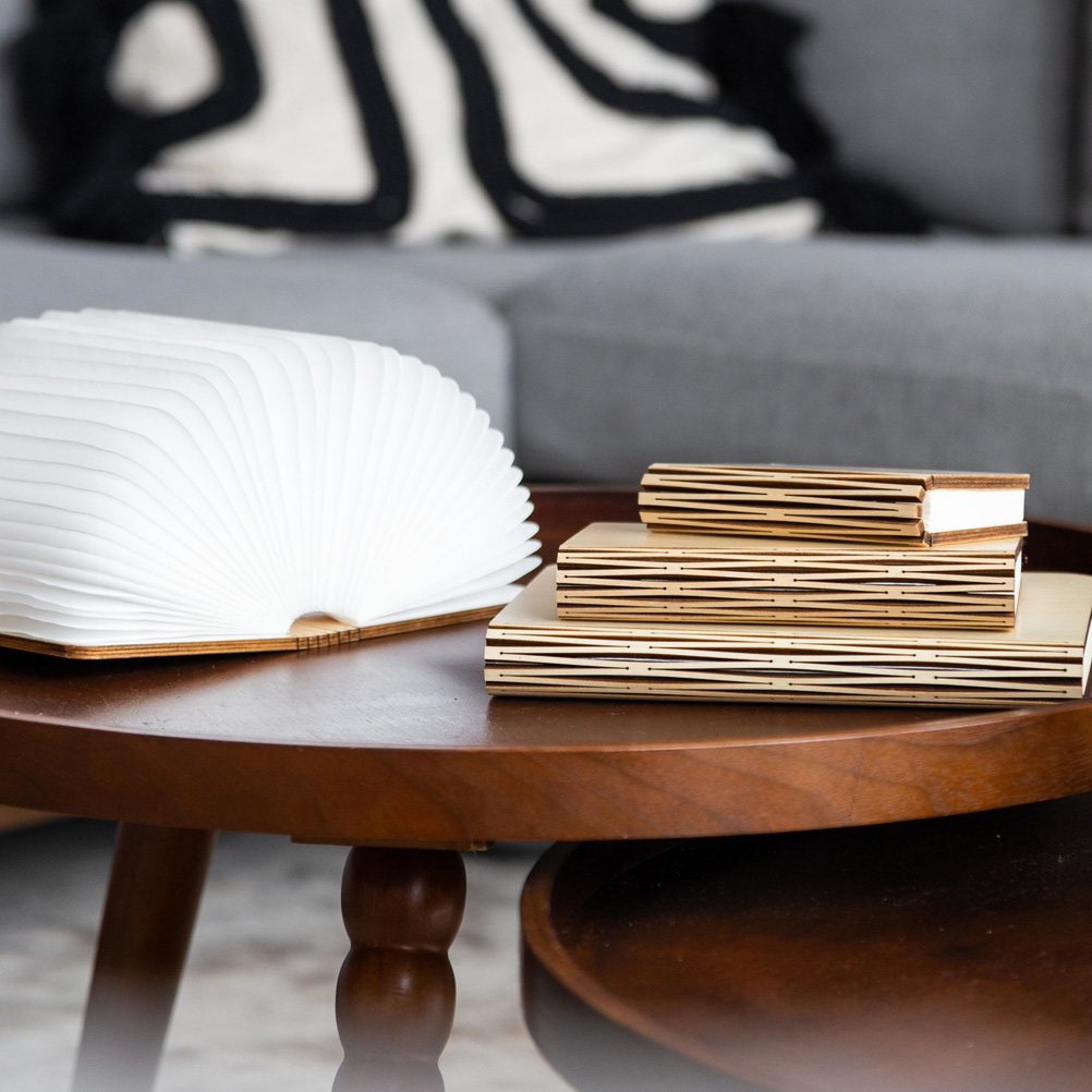 Lampe livre en bois véritable Erable - Taille L Matériau Bois d'érable, papier recyclable Dupont &trade Tyvek® Dimensions : Hauteur 21 cm - Largueur 17 cm - Profondeur 2.5 cm Rechargeable par câble USB (fourni) Autonomie : 4-6 h La lumière s'allume automatiquement lors de l'ouverture du livre et grâce à la flexibilité, il est possible de l'ouvrir à 360 degrés.