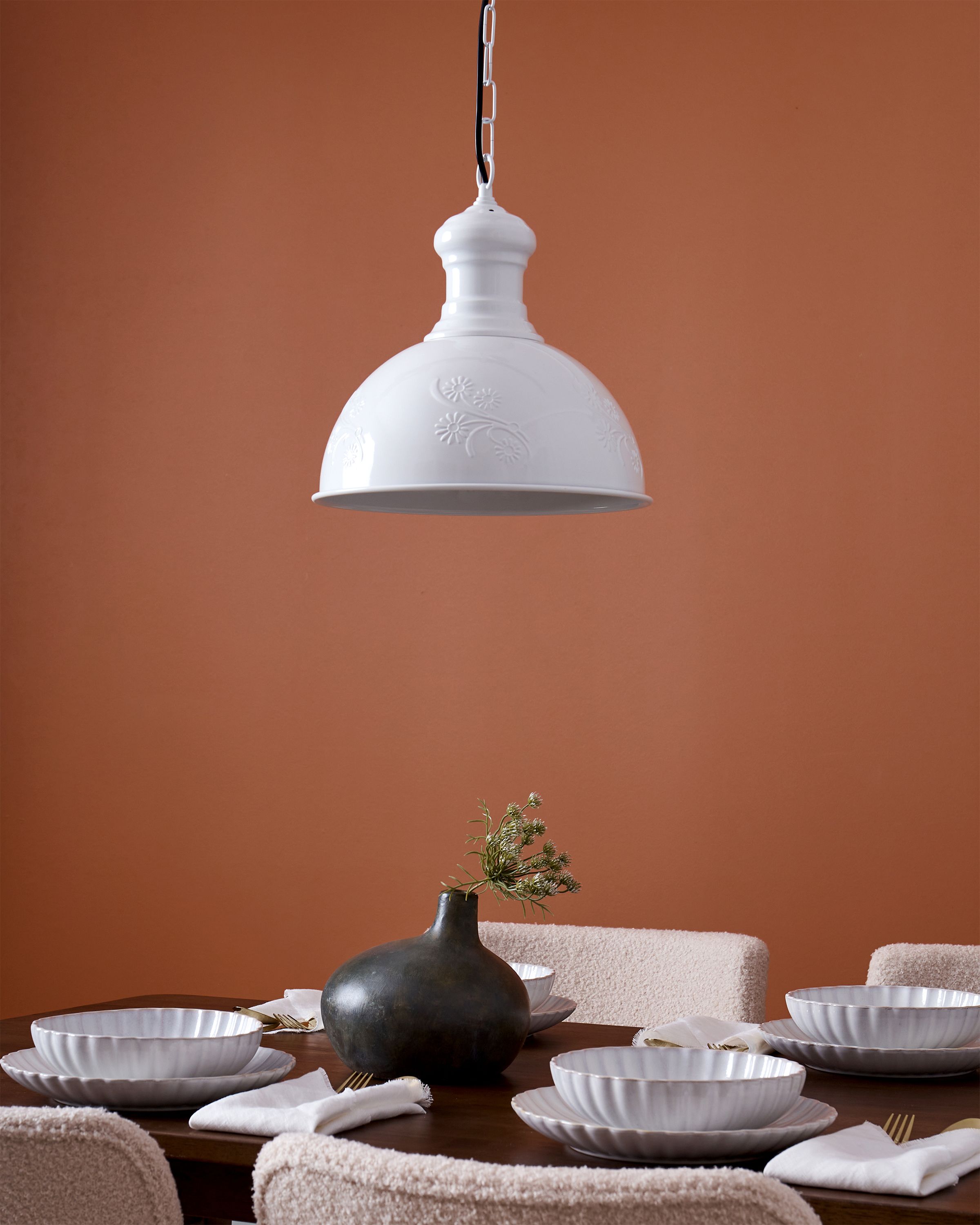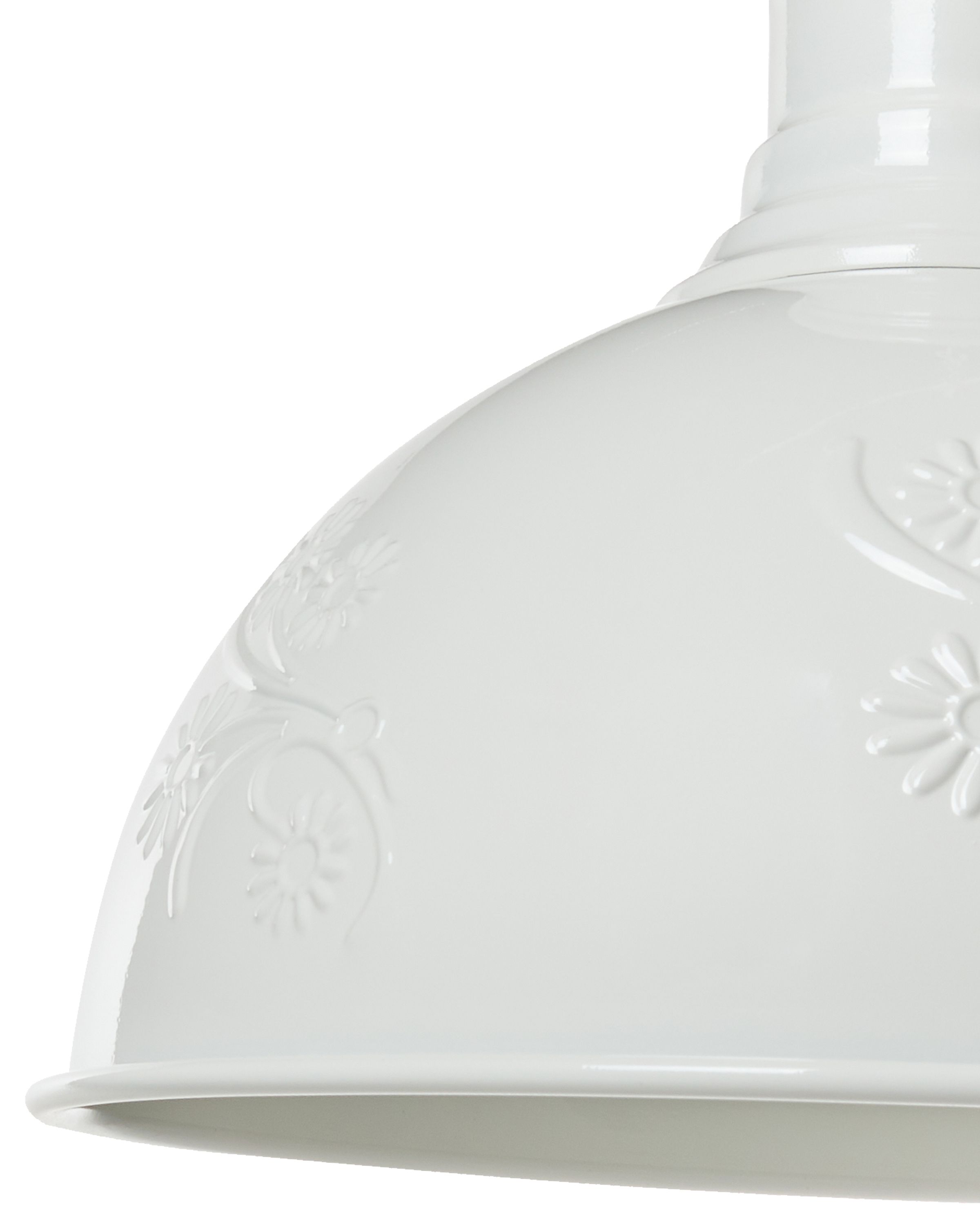 Lampe pendante rétro. Cette lampe suspension inspirée par les formes rétro s’harmonise parfaitement avec les intérieurs traditionnels, modernes et industriels. Fabriqué à partir d'un métal robuste, l'abat-jour en forme de cloche présente un motif floral délicat. Son plateau orné et sa suspension à chaîne s'harmonisent avec l'esprit rétro de cette lampe à la fois délicate et durable. Elle diffuse une lumière agréable et concentrée, idéale pour travailler ou étudier.