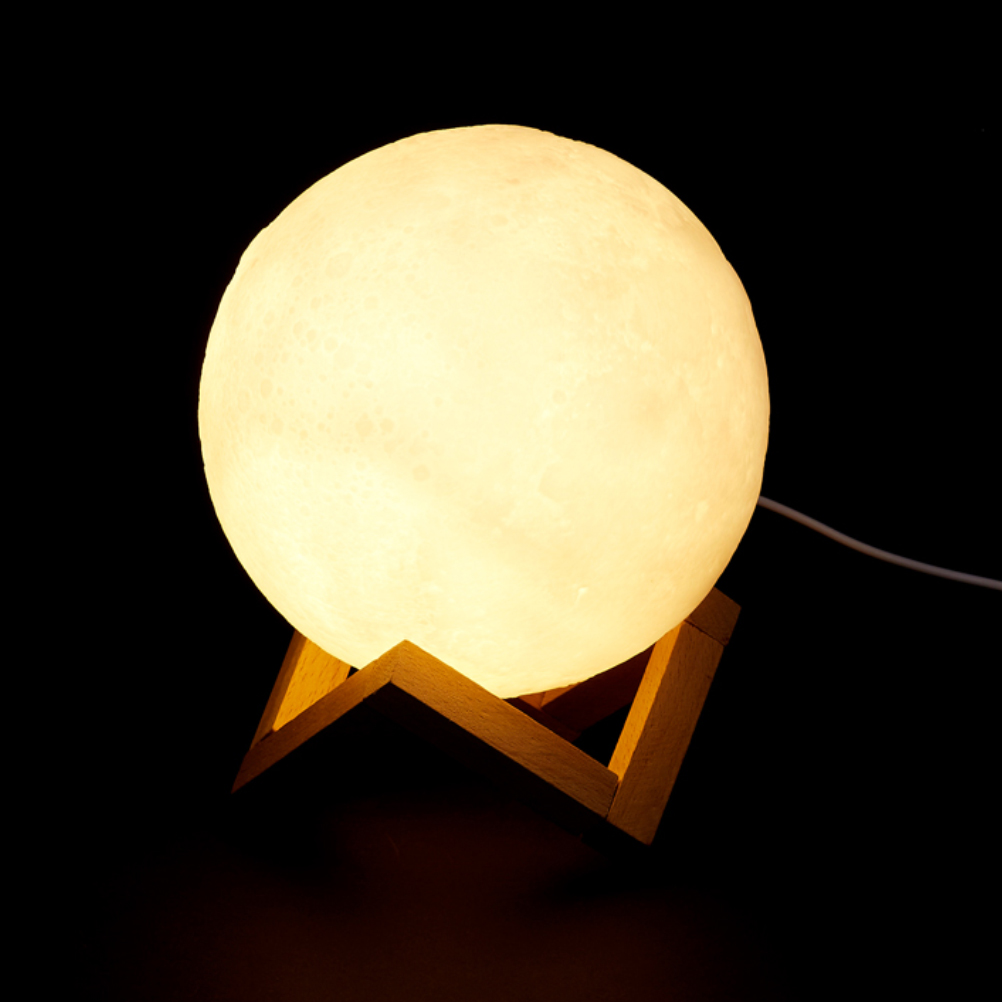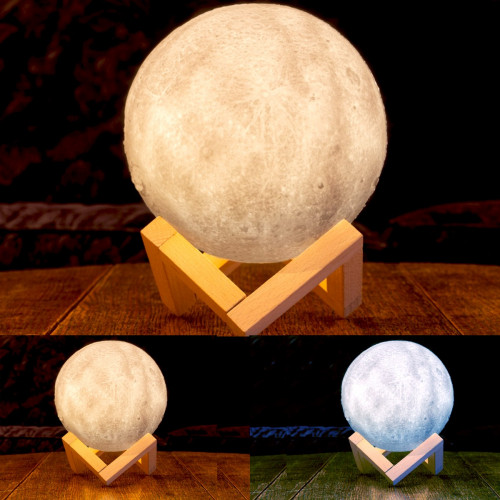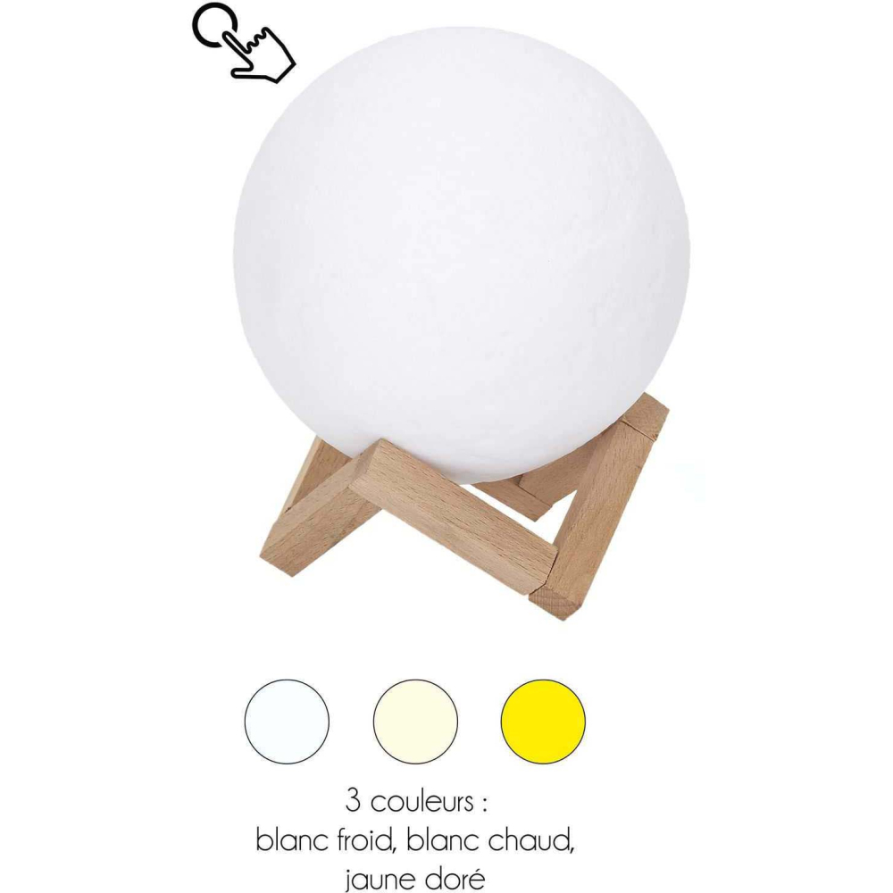 Lampe tactile lune 3 couleurs de lumière. Support en bois. Coloris : blanc Matière : plastique et bois Batterie : batterie lithium Alimentation : câble USB Dimensions : Hauteur 19 cm x Diamètre 15 cm