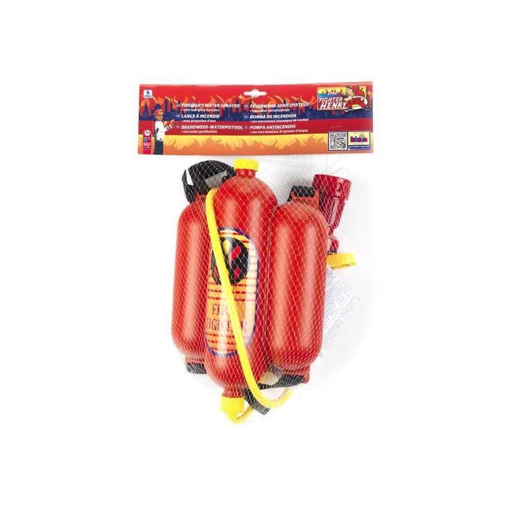 FIRE FIGHTER HENRY LANCE A INCENDIE AVEC RESERVOIR Pour venir à bout des flammes, voici une superbe lance à incendie ! Remplis le réservoir d'eau, d'une contenance d'environ 2 litres, et ferme-le à l'aide du bouchon. Grâce aux bretelles, tu peux porter le réservoir sur ton dos comme un sac à dos. Saisis la lance, règle le jet et éteins le feu ! A partir de 3 ans.