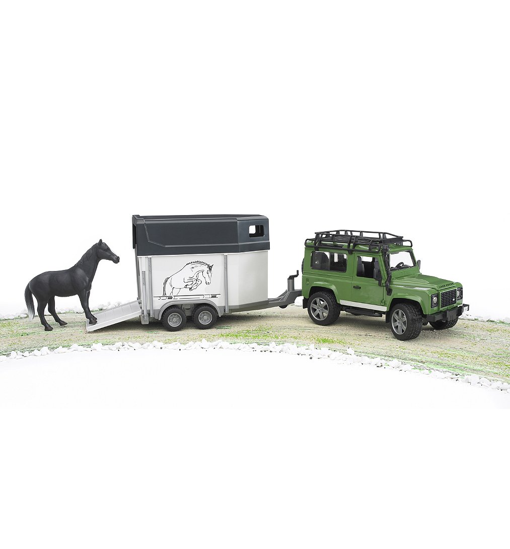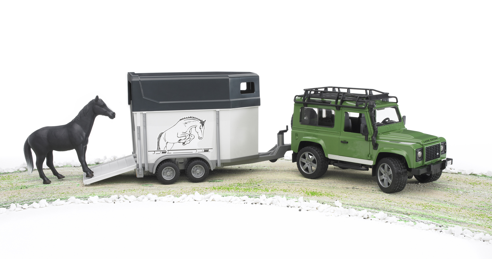 Land Rover Defender 90 break avec van et cheval. L'ensemble est fonctionnel, la porte du van s'ouvre. * Attelage remorque amovible * Roue de secours sur portière arrière * Véhicule vitré Van : Pied d'appui déposable au moyen d'une manivelle * Portière latérale ouvrante * Rampe déployable * Capot du moteur ouvrant muni d'un support escamotable et d'un bloc moteur tout en détails 1 cheval fourni. Compatible avec tous les tracteurs et Unimogs de la gamme BRUDER. Fabrication en plastiques de grande qualité tel ABS. Dim.: 61.5x14x18.5 cm