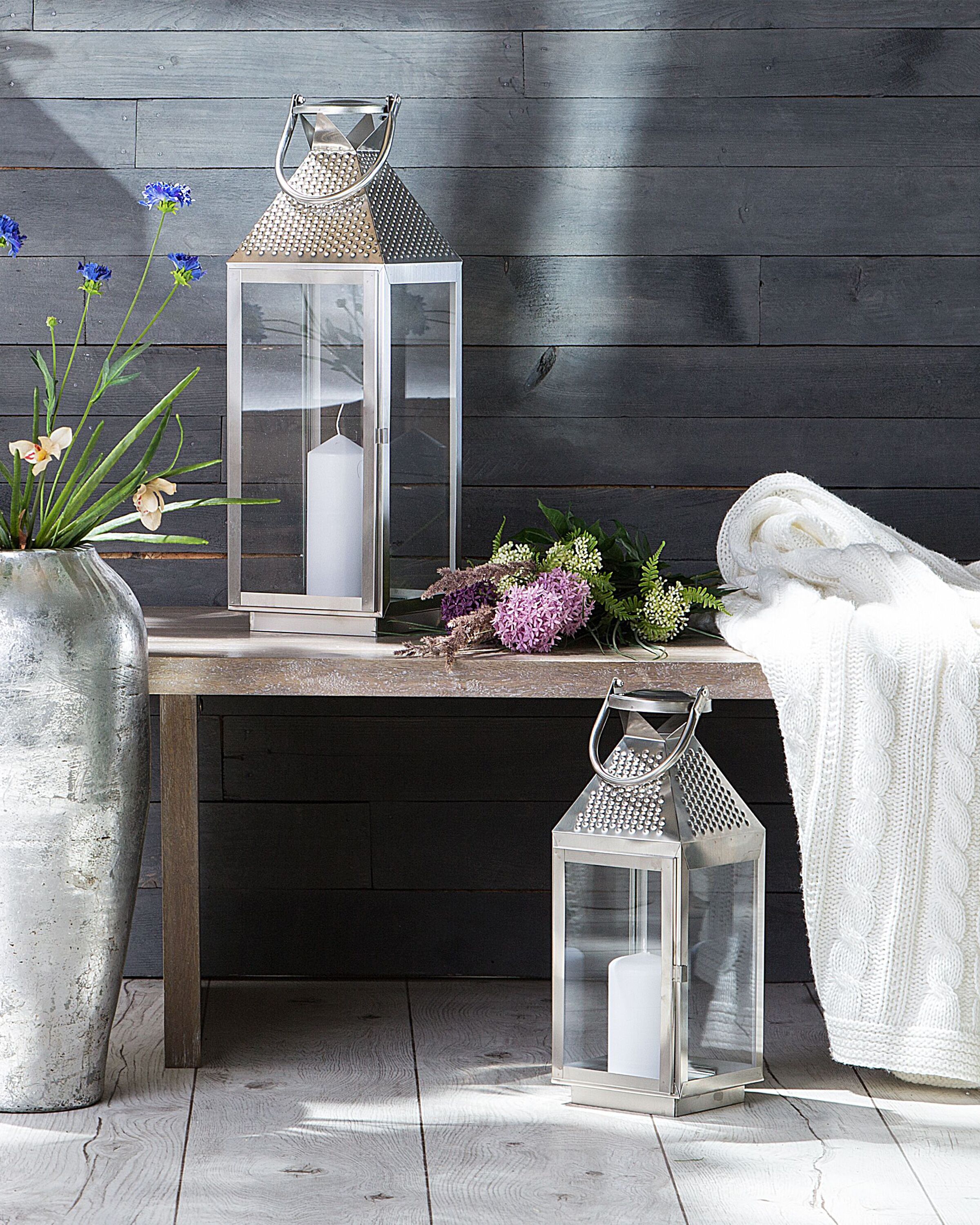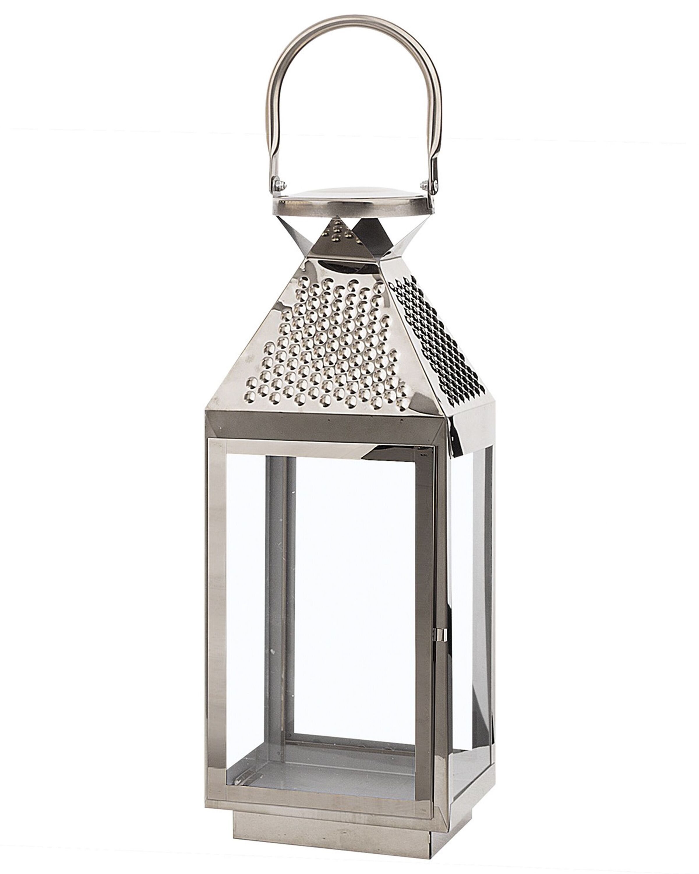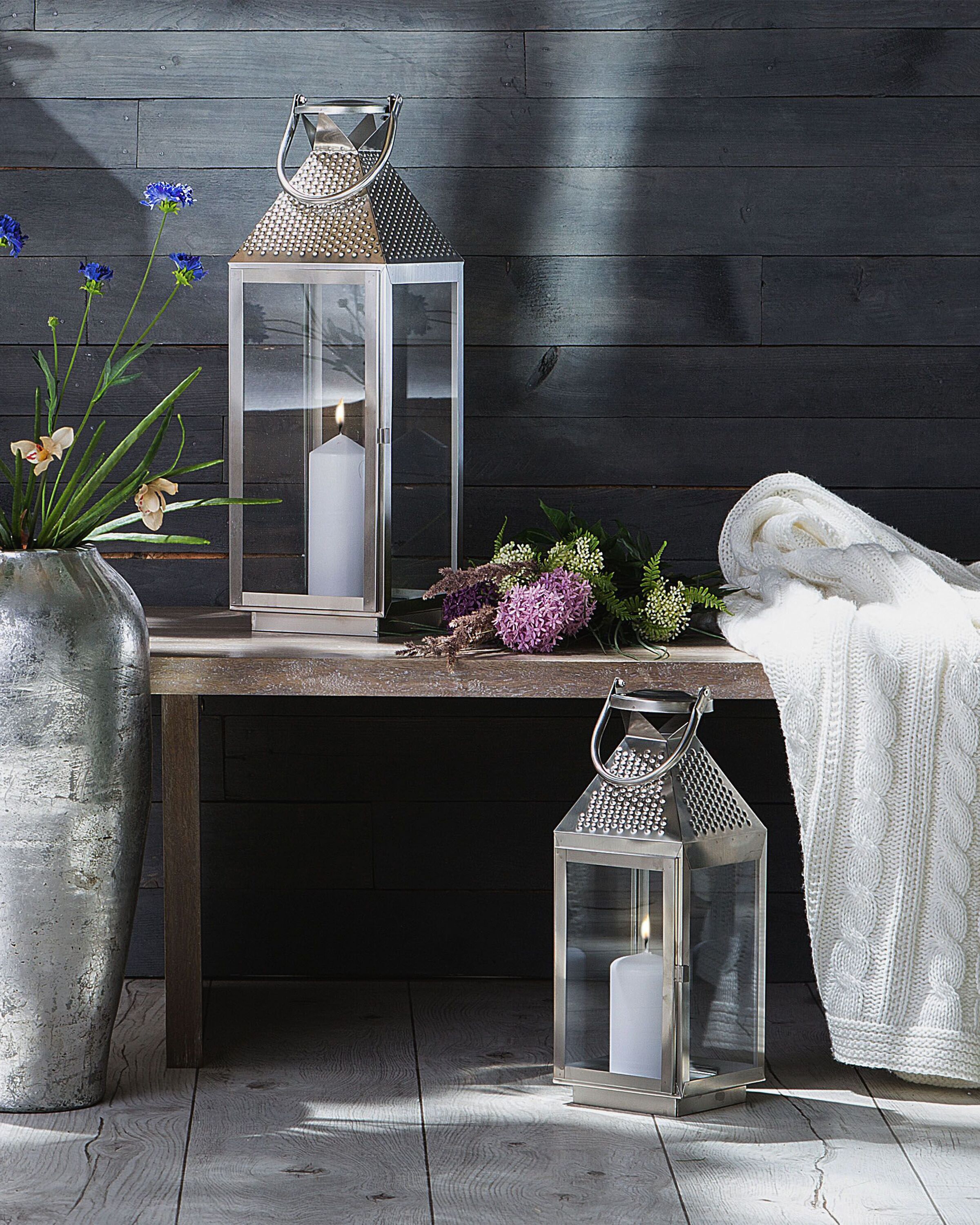 Lanterne argentée classique 40 cm. Inspirée par les formes industrielles, cette lanterne simple est sûre de devenir un élément audacieux dans n'importe quel environnement moderne et minimaliste. Fabriquée en acier inoxydable robuste et résistant, la pièce est dotée d'une poignée complémentaire qui souligne sa simplicité. Utilisez-la avec une bougie, des guirlandes lumineuses ou d'autres éléments de décor et créez une décoration unique en un clin d'œil.