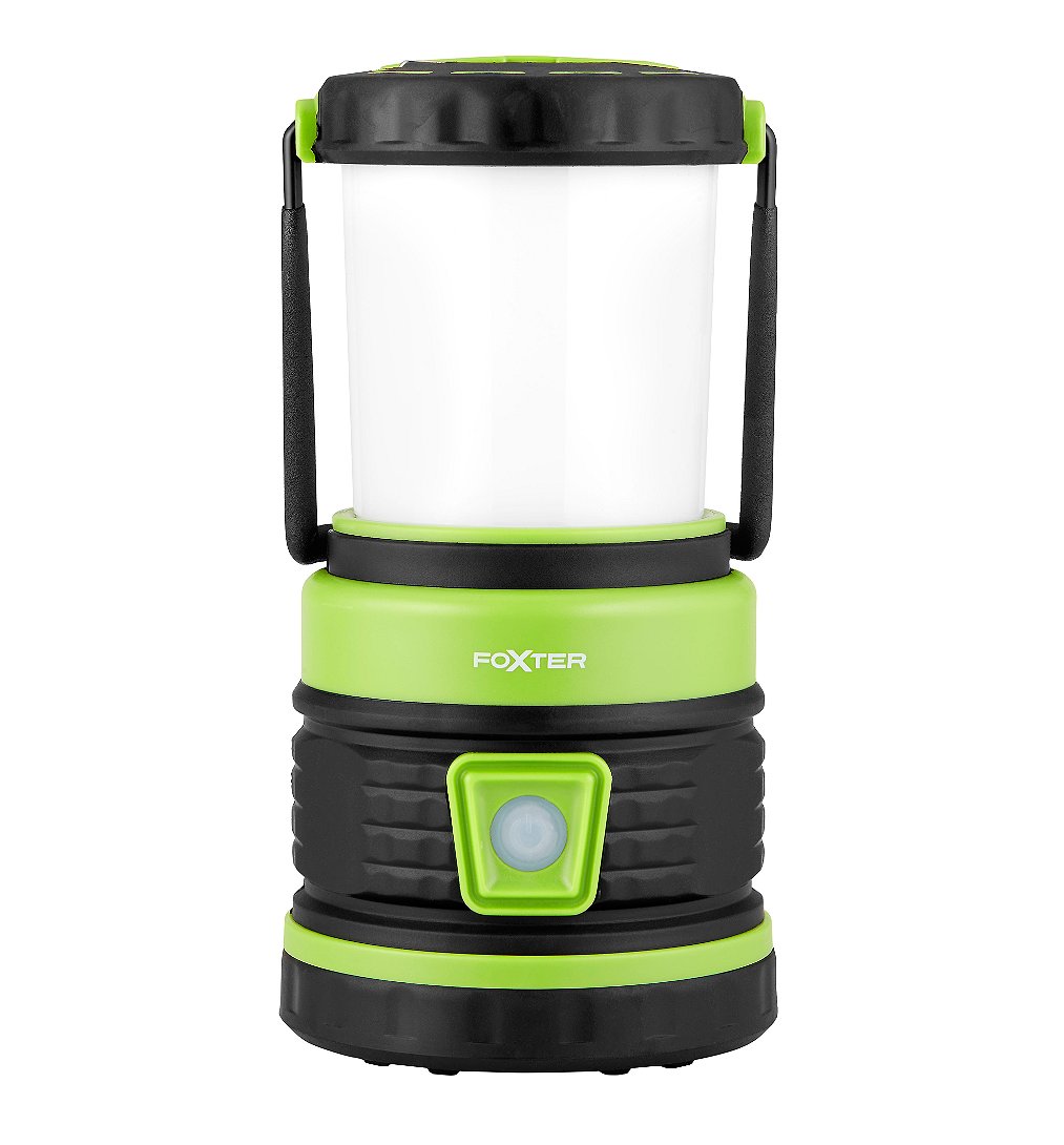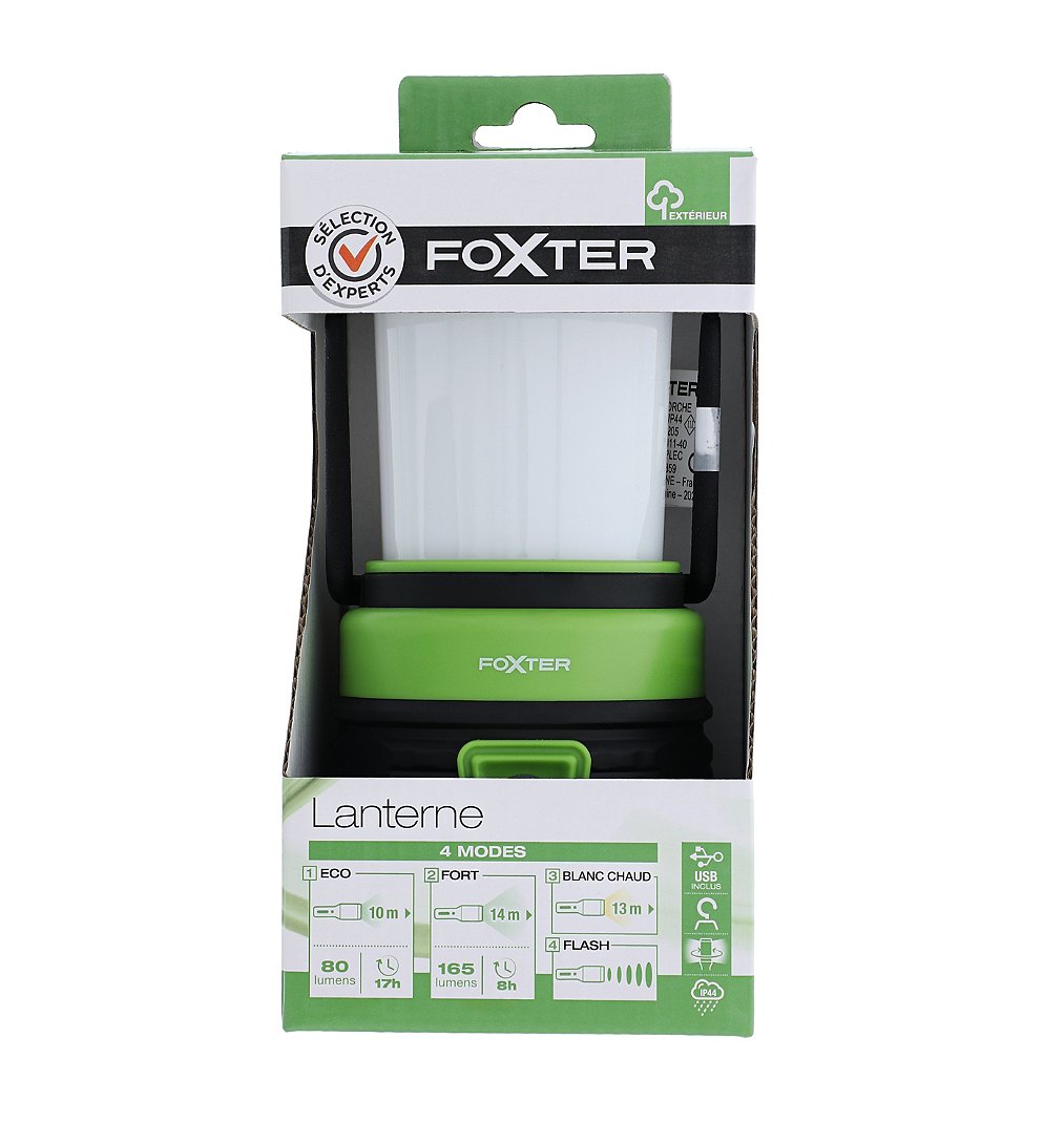 Lanterne LED - Sélection d'Experts - Foxter - 4 modes d'éclairage : eco, fort, blanc chaud, flash - Mode eco : Portée de 10m 80 lumens 17h de fonctionnement - Mode fort : Portée de 14m 165 lumens 8h de fonctionnement - Mode blanc chaud : Portée de 13m - Mode flash : instantané - Rechargeable via USB (câble USB inclus) - Accroche pour suspendre la lampe - Tête lumineuse rotative - Protection IP44