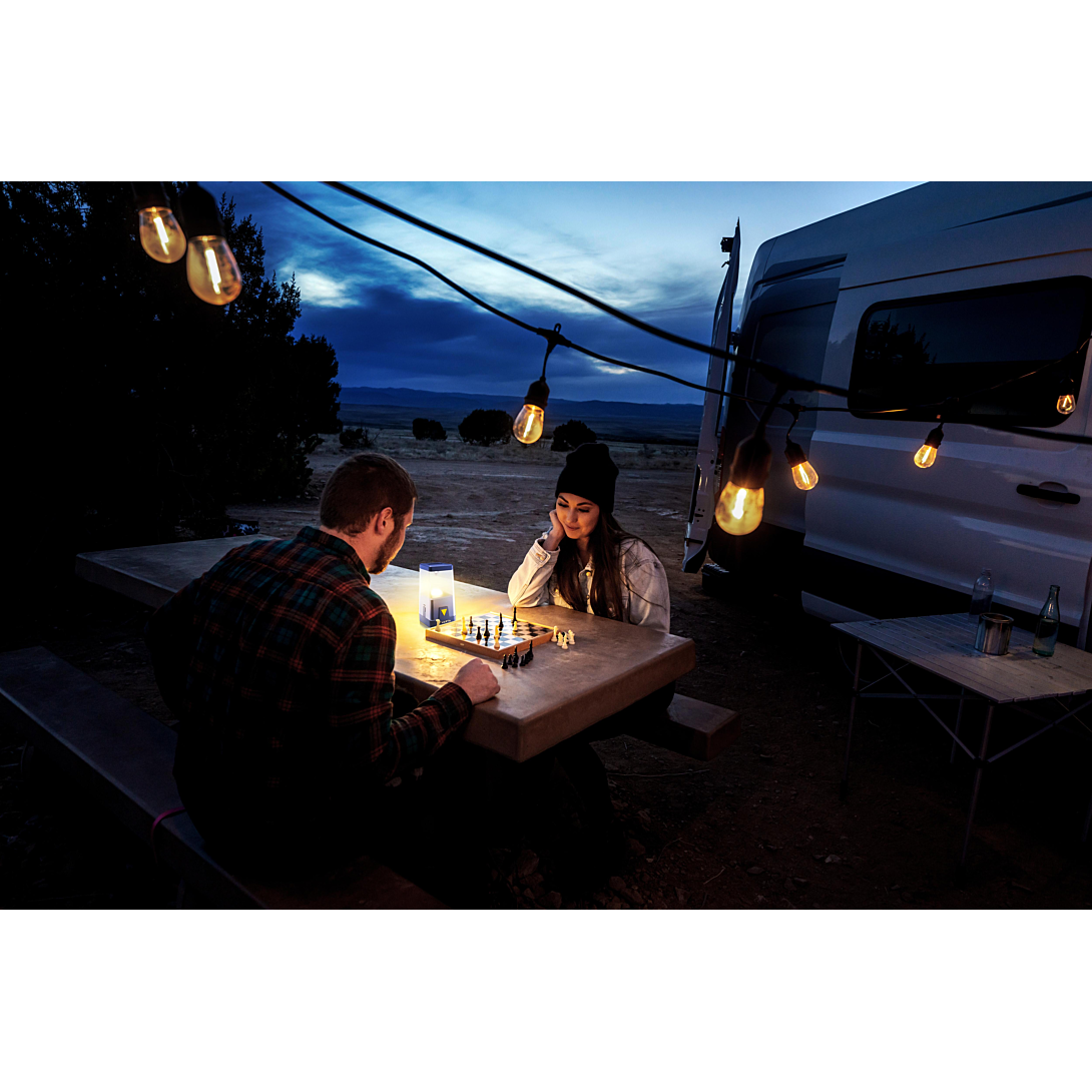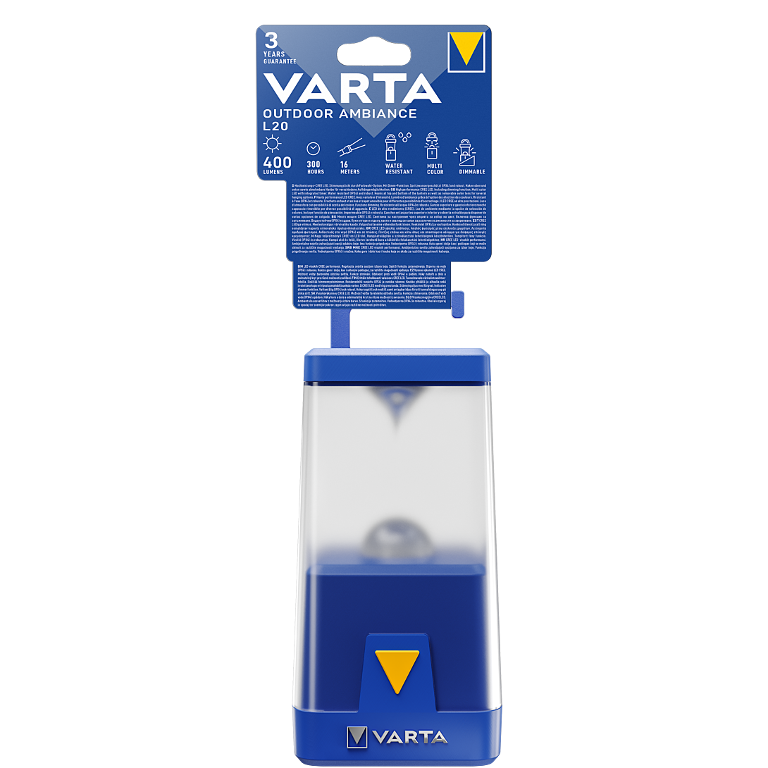 VARTA Outdoor Ambiance Lantern L20 6AA non incl. Lanterne avec LEDs hautes performances, au design VARTA unique comprenant une fonction dimmable et de multiples modes de couleurs (rouge, vert, bleu, jaune, magenta et cyan). Crochets supérieur et inférieur intégrés, et lentille amovible pour de multiples options de suspension et éclairage par le bas, direct. Intensité lumineuse jusqu'à 400 lm, autonomie 300h, portée du faisceau 16m