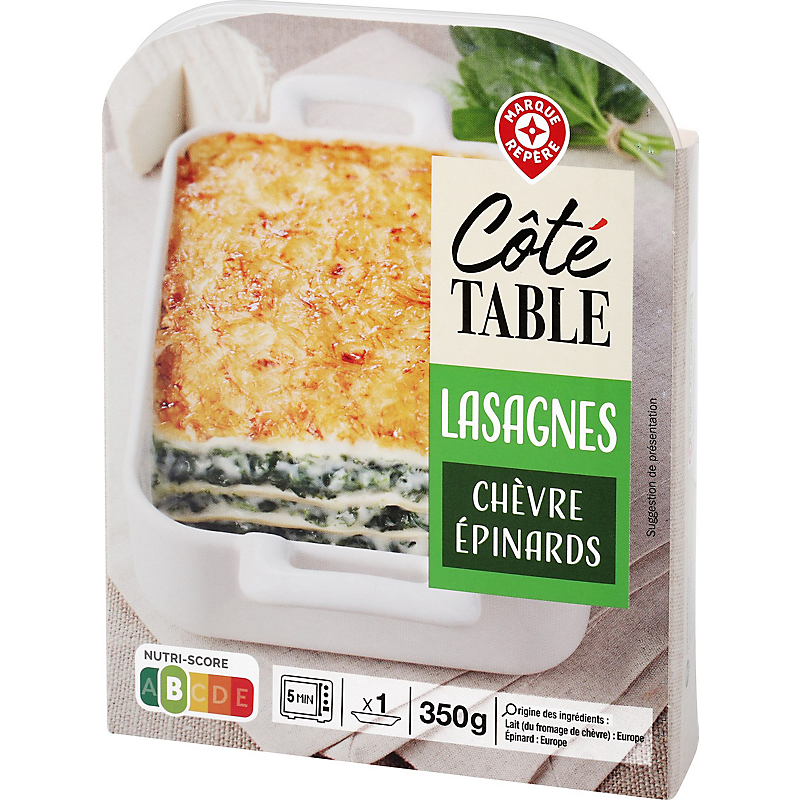 Pâtes alimentaires précuites type lasagnes garnies d'une préparation au fromage de chèvre et aux épinards, aromatisées. COTE TABLE