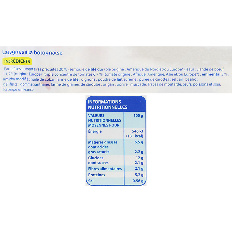 Ingrédients: Eau ; pâtes alimentaires précuites 20 % (semoule de blé dur, eau) ; viande bovine 11,2 % ; triple concentré de tomates 6,7 % ; emmental 3 % ; amidon modifié ; huile de colza ; farine de blé ; oignons ; poudre de lait écrémé ; purée de carottes ; sel ; ail ; basilic 0,08 % ; gélifiants : E415, farine de graines de caroube ; origan ; poivre ; muscade.