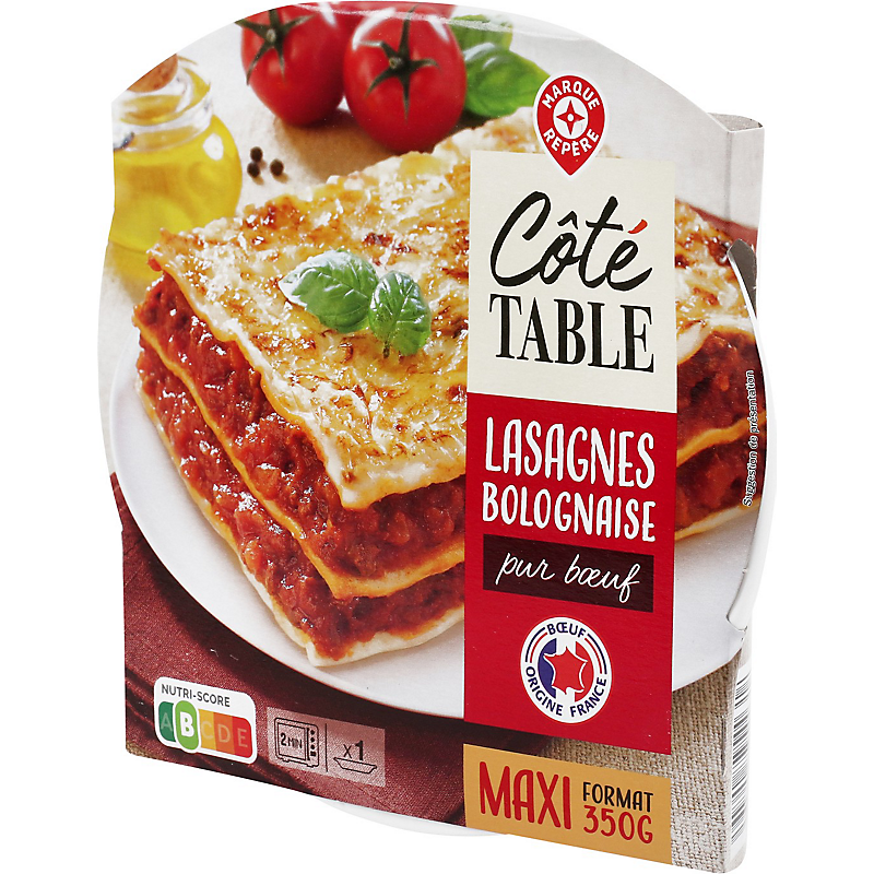 | Origine des principaux ingrédients | BOEUF ORIGINE : FRANCE, TOMATE ORIGINE : ESPAGNE, GRECE, ITALIE ET/OU PORTUGAL*, BLE (DES PÂTES A LASAGNES) ORIGINE : CANADA, FRANCE, GRECE ET/OU ITALIE* * SELON LES APPROVISIONNEMENTS ET/OU LES CARACTÉRISTIQUES GUSTATIVES RECHERCHÉES |
