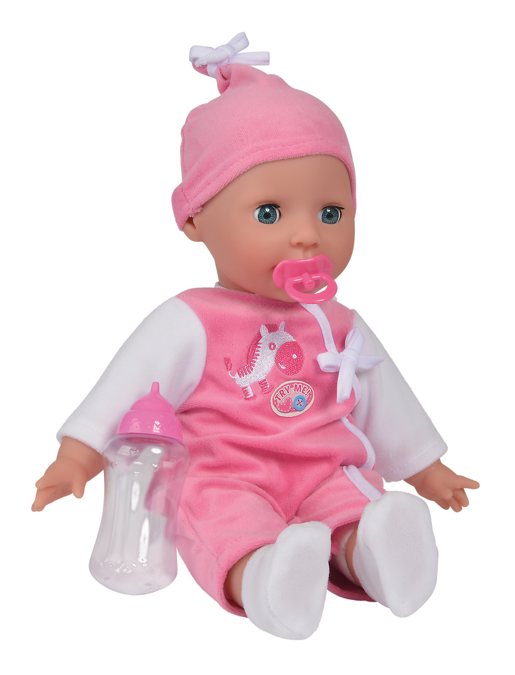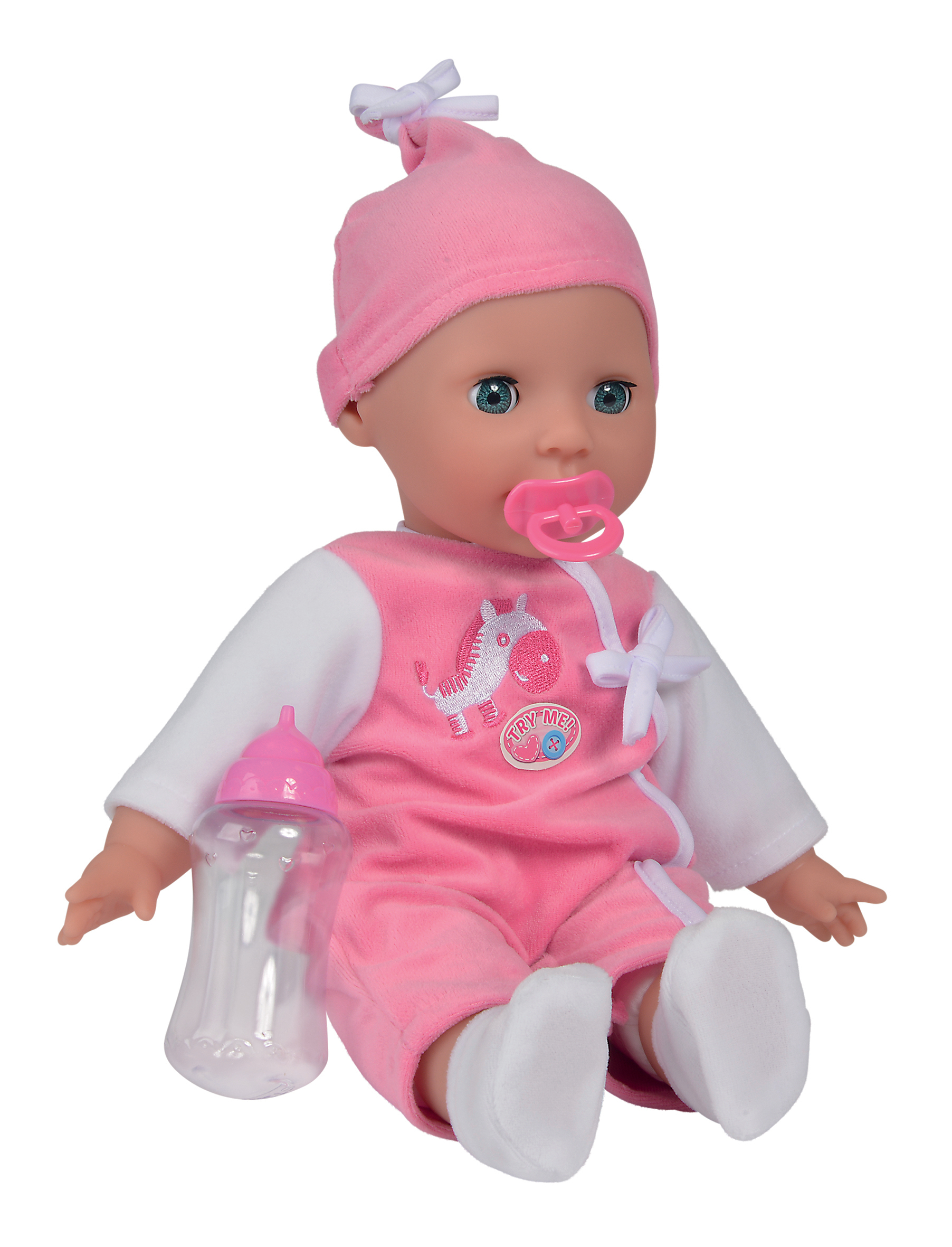 Poupon de 38cm avec un corps souple. Il est habillé d'une grenouillère et d'un bonnet, et possède des yeux dormeurs : les yeux se ferment quand on l'allonge - Le poupon sait prononcer 24 sons de bébé : "maman", "dada", "hihi" - Le set comprend aussi 1 tétine et 1 biberon - Pour les enfants à partir de 2 ans - 3 piles LR44 incluses.