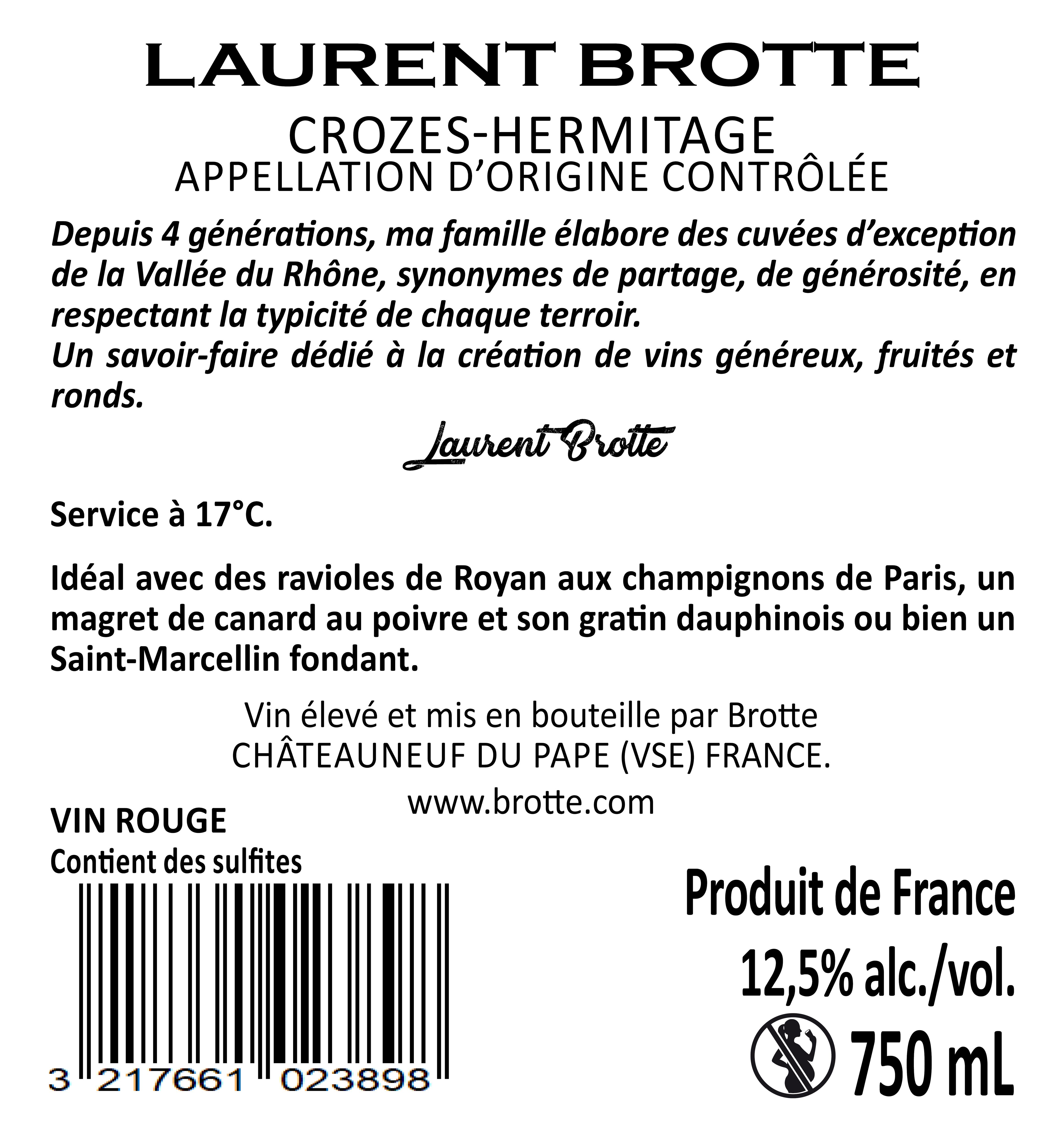 | Libellé | Laurent Brotte, 2023 - Crozes-Hermitage AOP - Rouge - 75 cl |