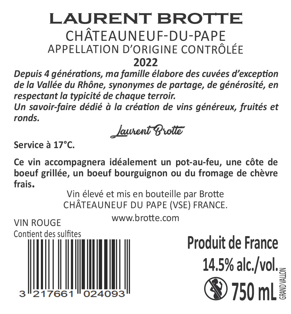 | Libellé | Laurent Brotte Grand Vallon, 2022 - Châteauneuf-du-Pape AOP - Rouge - 75cl |
