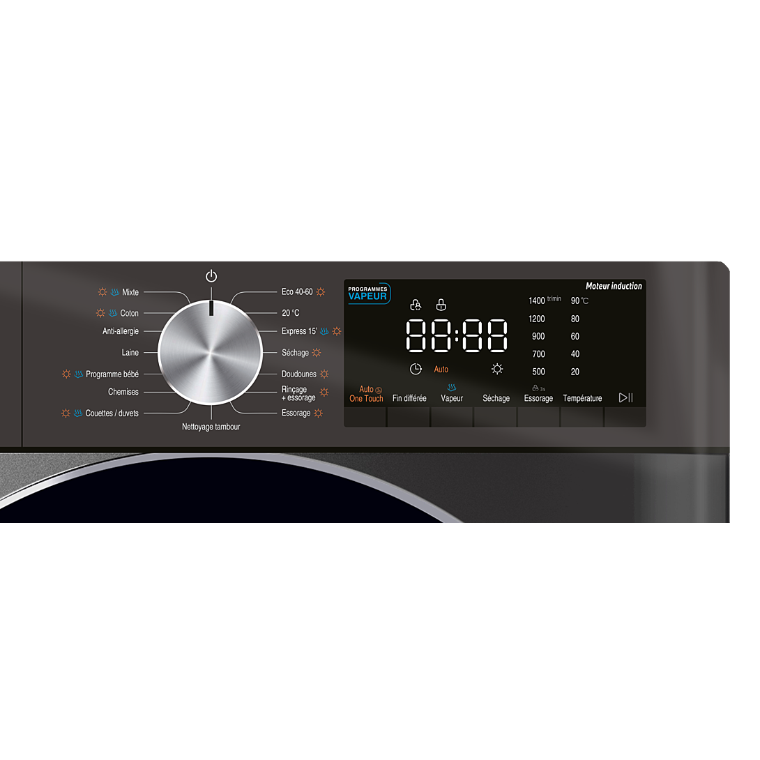 Lavante-séchante - 10 kg / 6 kg - 1400 tours/min - Dark Silver- Moteur Induction - 14 programmes ( programmes standard, vapeur, séchage ) - Dark Silver Ouverture de porte - Sécurité enfant - Anti-débordement - Anti-mousse - Anti-balourd